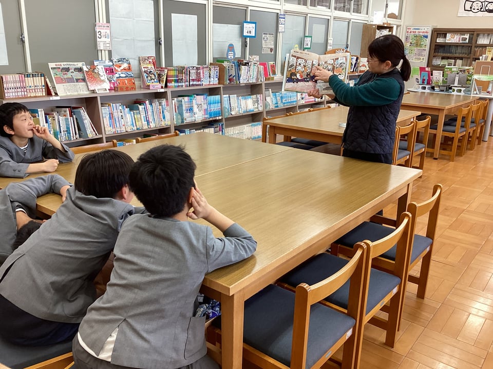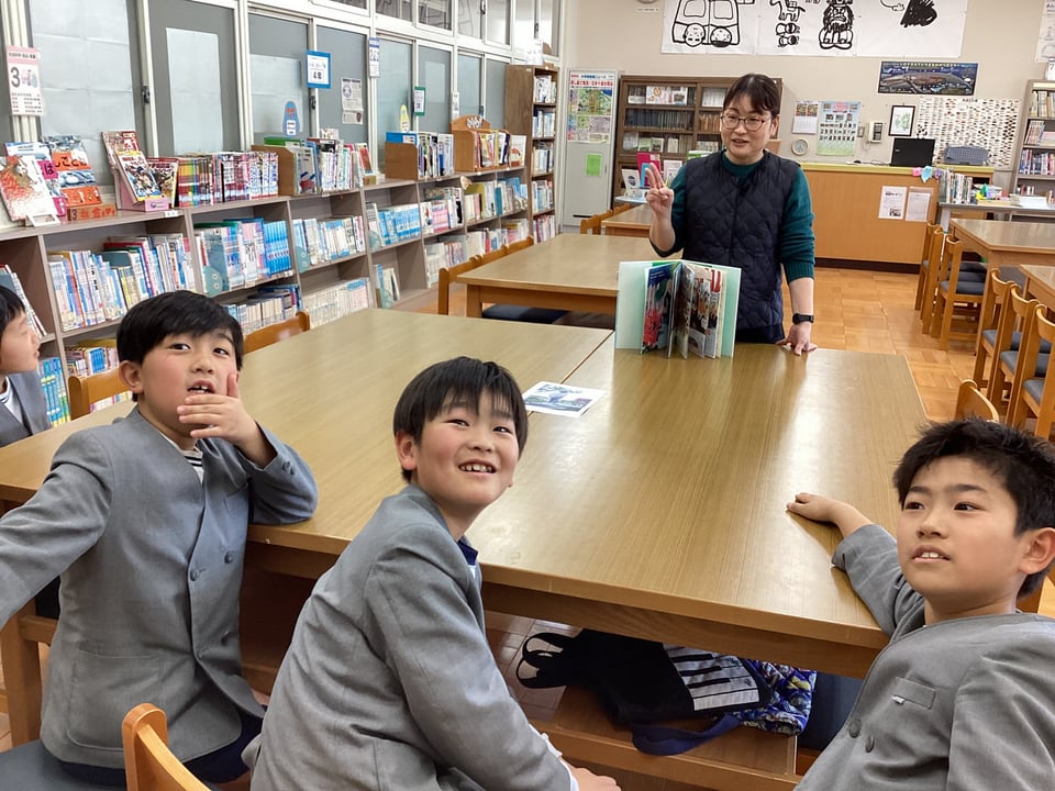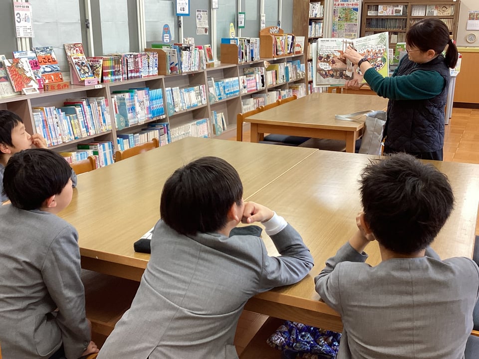 2月20日、学校司書さんが3・4年生に向けて、宇部市制施行100周年記念で刊行された「みんなの宇部ものがたり」を読み聞かせしてくださいました。3・4年生には難しい言葉に解説を入れてくださったり、当時の様子を詳しく説明してくださったりしながら、子どもたちにもとても分かりやすく絵本の読み聞かせをしてくださいました。途中には、絵本に書かれていた内容に関する三択クイズを出してくださることで、楽しみながら話の内容を聞くことができました。この読み聞かせをよい機会として、子どもたちが宇部の成り立ちや歴史について興味をもってくれることを期待しています。