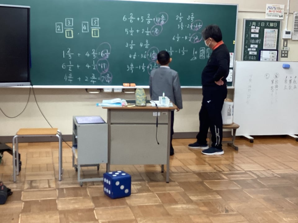 なかよし学級では、算数「分数のたし算・ひき算」をゲーム形式で楽しみながら学習を進めていました。サイコロの出た目に合わせて、分母と分子の数を決め、計算できるかどうかも確認します。そうすることで、学ぶ意欲を高めながら、分数の計算に取り組むことができました。楽しみながらも、正確に計算することができていました。