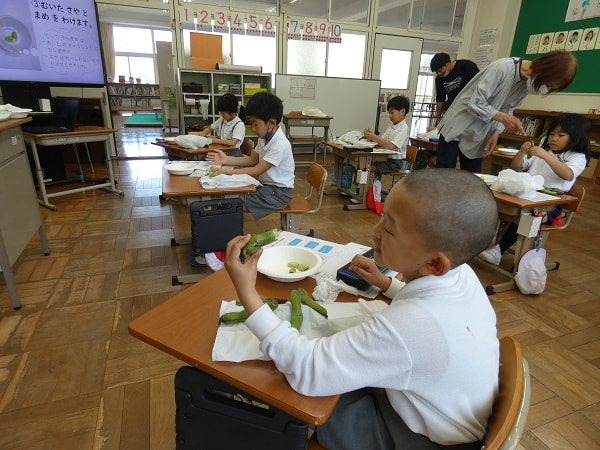 地域の方からたくさんのそら豆をいただきました。栄養教諭の説明を聞きながら、1・2年生の子どもたちがそら豆のさやむきを体験しました。さやから出てくる大きなそら豆に大喜びの子どもたちでした。自分たちがさやをむいたそら豆が給食に出ます。調理員さん、おいしいそら豆をお願いします。