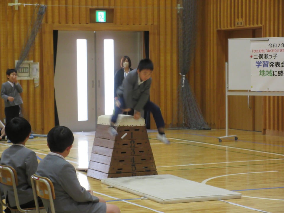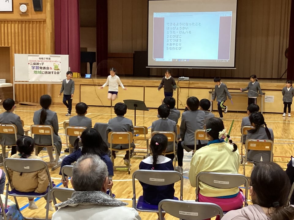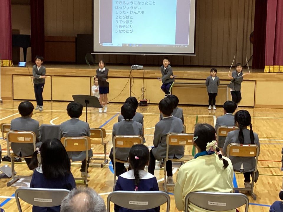 今回は1・2年生の生活科「できるようになったこと発表」を紹介します。1・2年生は、この1年間にたくさんのことができるようになり、一番成長著しい学年と言えます。60名もの観衆を前にして、堂々と自分ができるようになったことを発表するとても頼もしい姿を見ることができました。歌や鍵盤ハーモニカ、跳び箱、鉄棒、あやとり、なわとびのたくさんの演技を自信をもって発表することができました。参観してくださったみなさんの声援や拍手が何より励みとなったはずです。ありがとうございました。