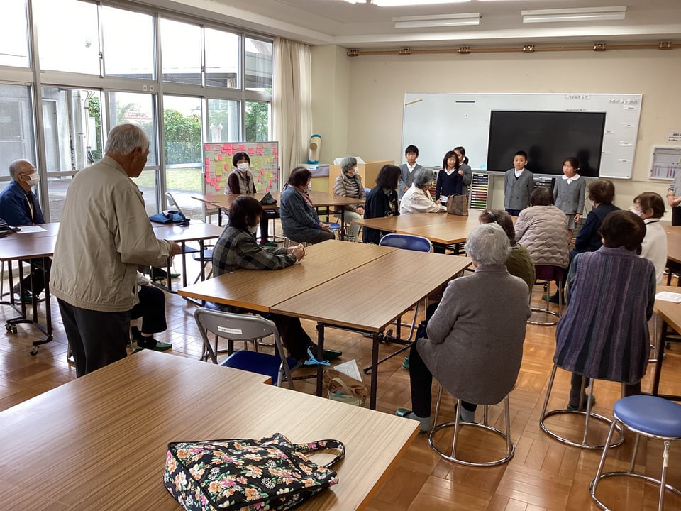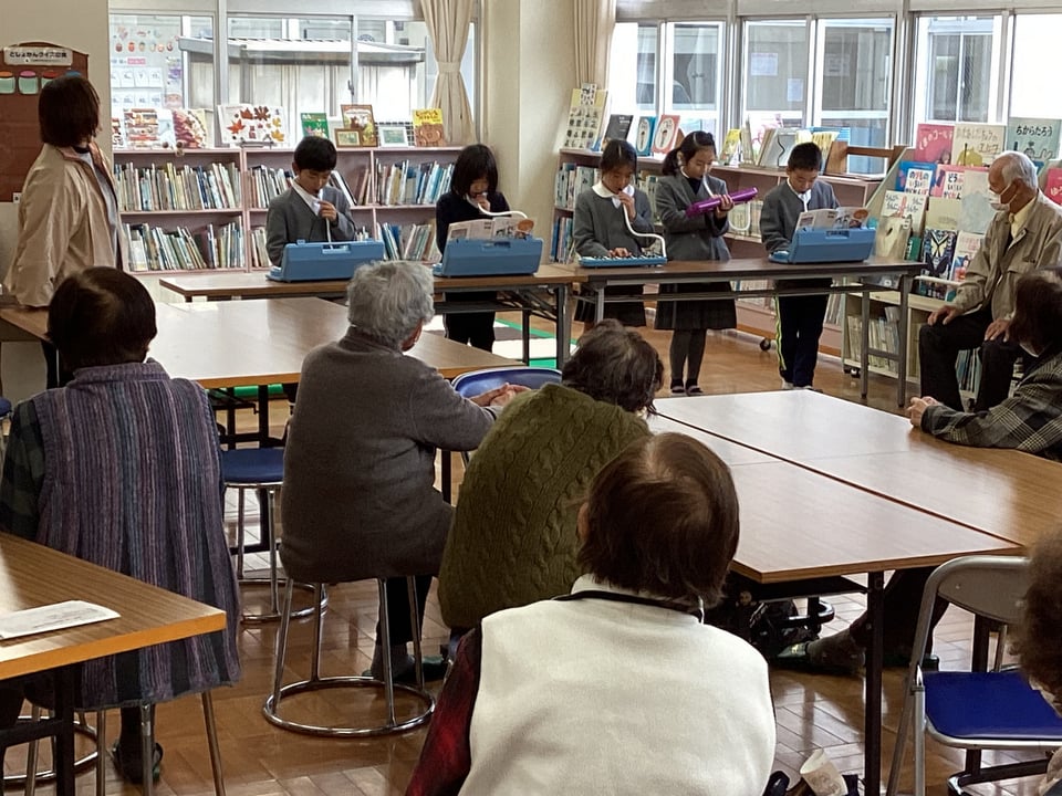 11月20日、1・2年生と松寿会のみなさんとの交流活動の様子です。1・2年生は、3・4年生と合同で高齢者のみなさんの「肩たたき」を行った後、自己紹介をして鍵盤ハーモニカでの合奏を発表しました。松寿会のみなさんからは大きな拍手をいただきました。