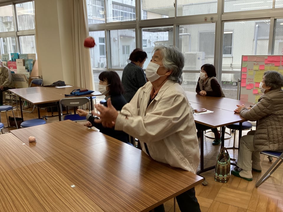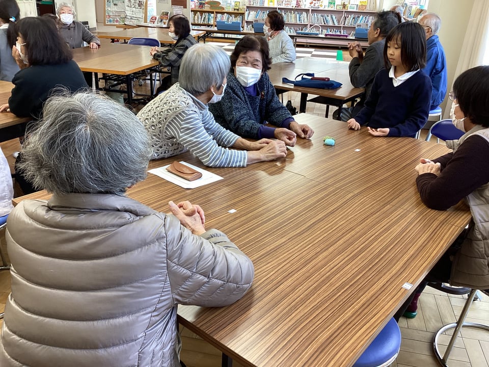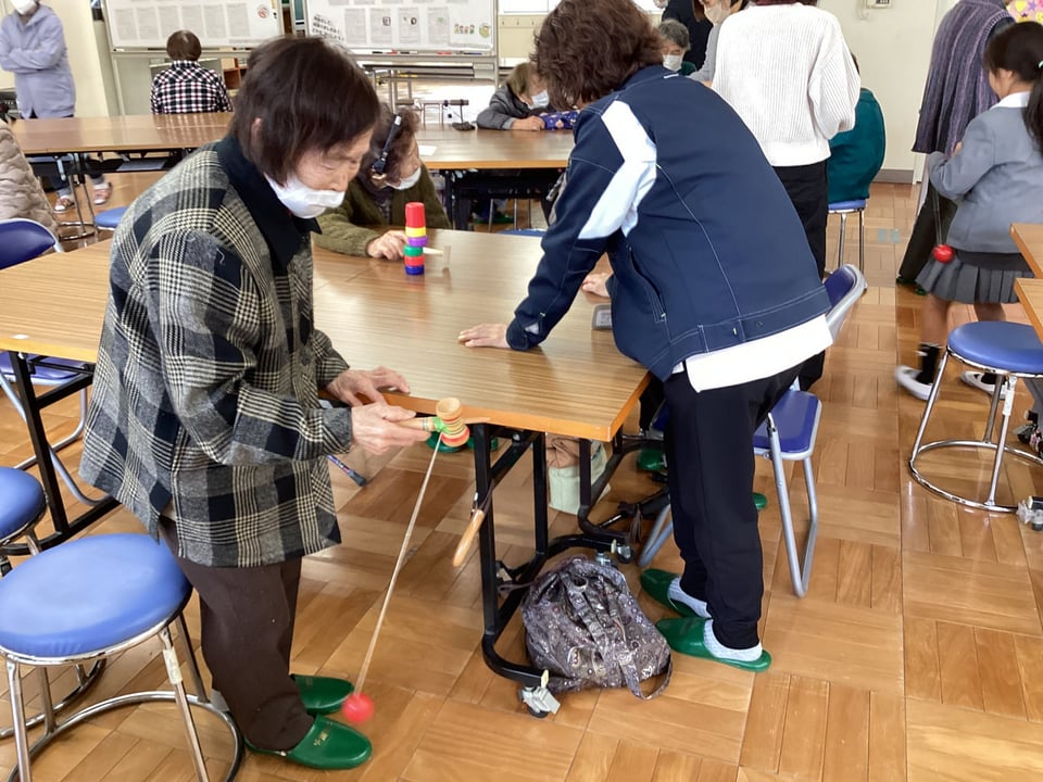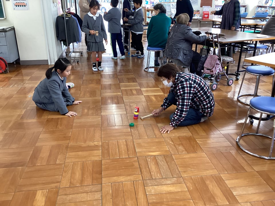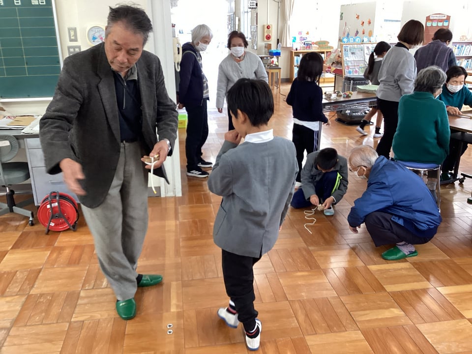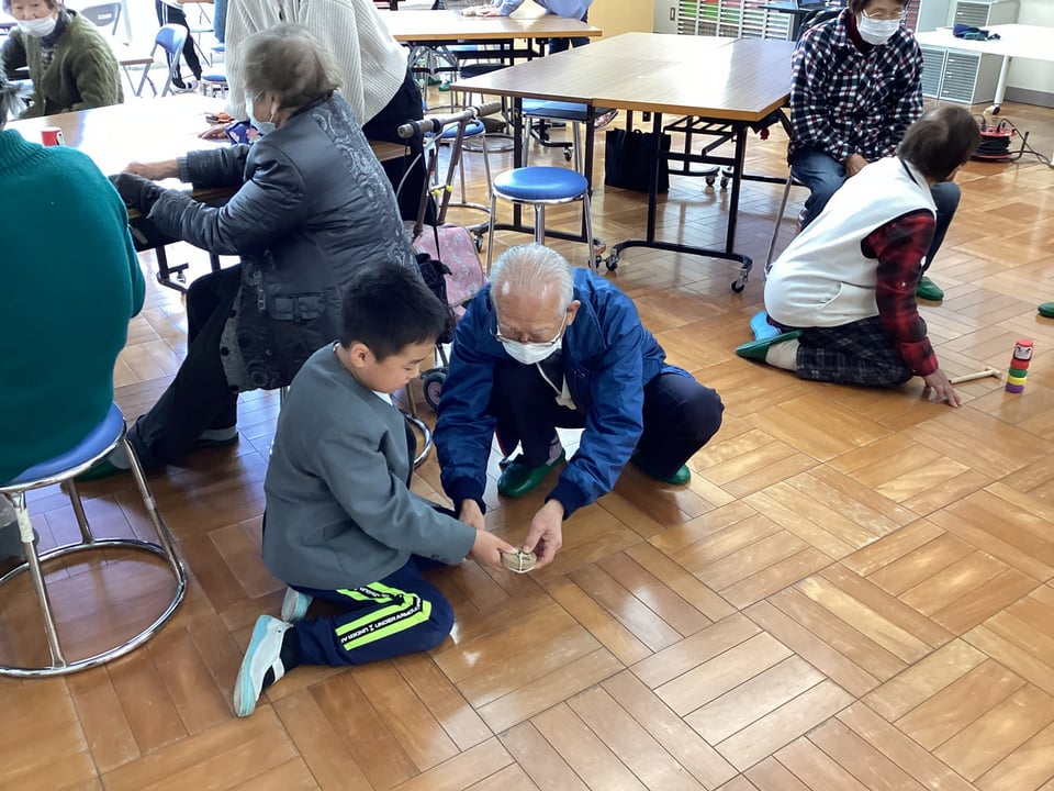 そして、1・2年生から、こま回しやお手玉、だるま落としなどの昔遊びについて自分が困っていることを発表があり、松寿会のみなさんに教えていただくことになりました。楽々とこま回しやお手玉、だるま落としをされる松寿会のみなさんの姿を見て、子どもたちは感心するばかりでした。すぐに、子どもたちは高齢者のみなさんのところに行って教えてもらいますが、なかなかうまい具合にいきません。やはり、練習あるのみということでしょうか?1・2年の子どもたちは、「松寿会のみなさんのように、上手になりたい!」という思いを膨らませる会となりました。松寿会のみなさん、今度ゆっくりと教えてください。よろしくお願いいたします。