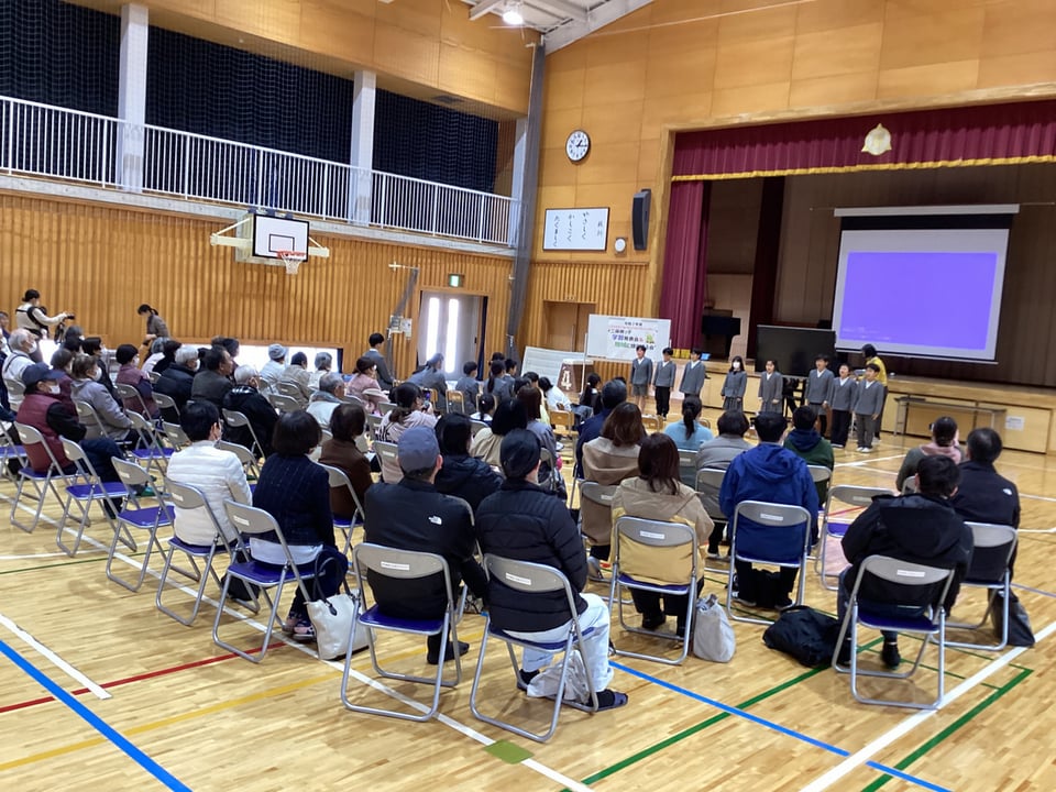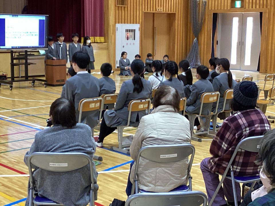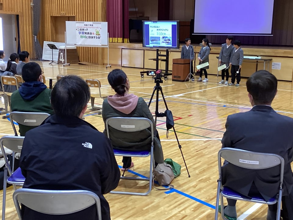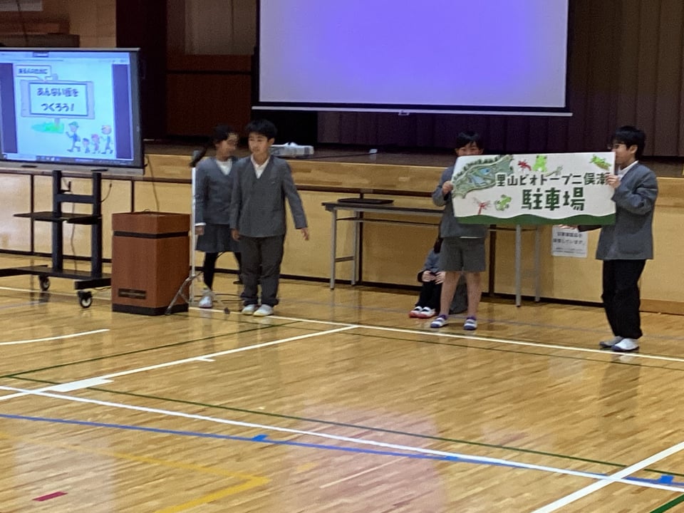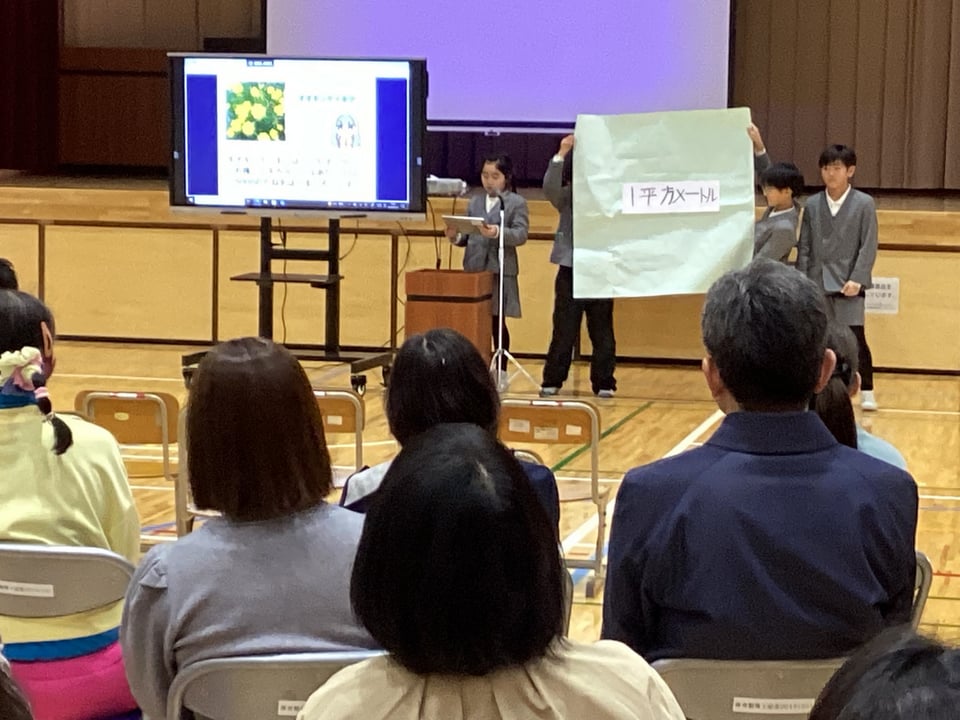 2月19日の学習発表会で3・4年生は、総合「ビオトープをもっと楽しい場所にしよう」について、自分たちが取り組んできたことを発表しました。子どもたちは、総合の時間に「二俣瀬ビオトープを人にとっても、生き物にとっても楽しい場所にする」ことを目標にして活動に取り組んできました。