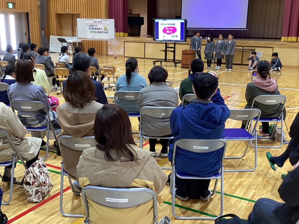 このように、自分たちの目標「二俣瀬ビオトープを人にとっても、生き物にとっても楽しい場所にする」ための今年度の活動の意図と実践してきたことを、パワーポイント資料を用いて分かりやすく、自分たちの思いをはっきりと、みんなに伝えることができました。自分たちの思いや願い、そして、設定した目標に向けて取り組んできたことを一人ひとりが堂々と発表する姿に感心しました。3・4年生のみなさん、取組はスタートしたばかりです。今年度の取組をぜひ、来年度につなげていき、わたしたちの願い「ビオトープをもっと楽しい場所にしよう」の実現に向けて、地域の方々とともに、活動を広げていってください。