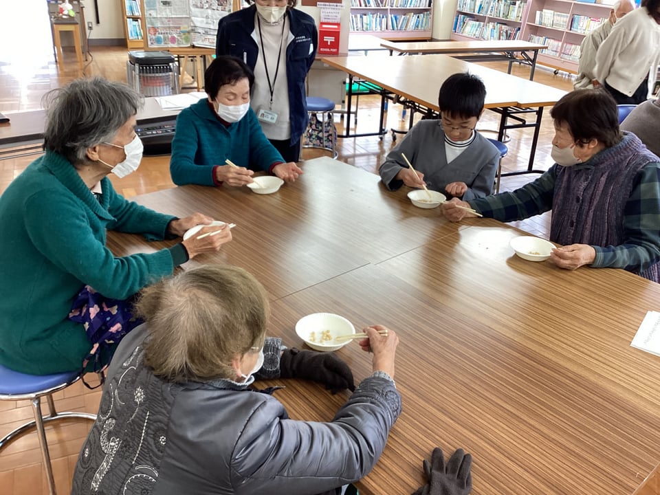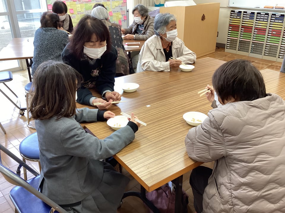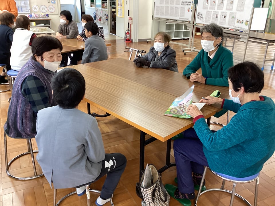 まずはじめに、グループに分かれて子どもたちが松寿会のみなさんに「昔好きだった給食のメニューや思い出に残っている給食」についてインタビューしました。子どもたちは、今の給食との違いに興味津々で話を聞いていました。