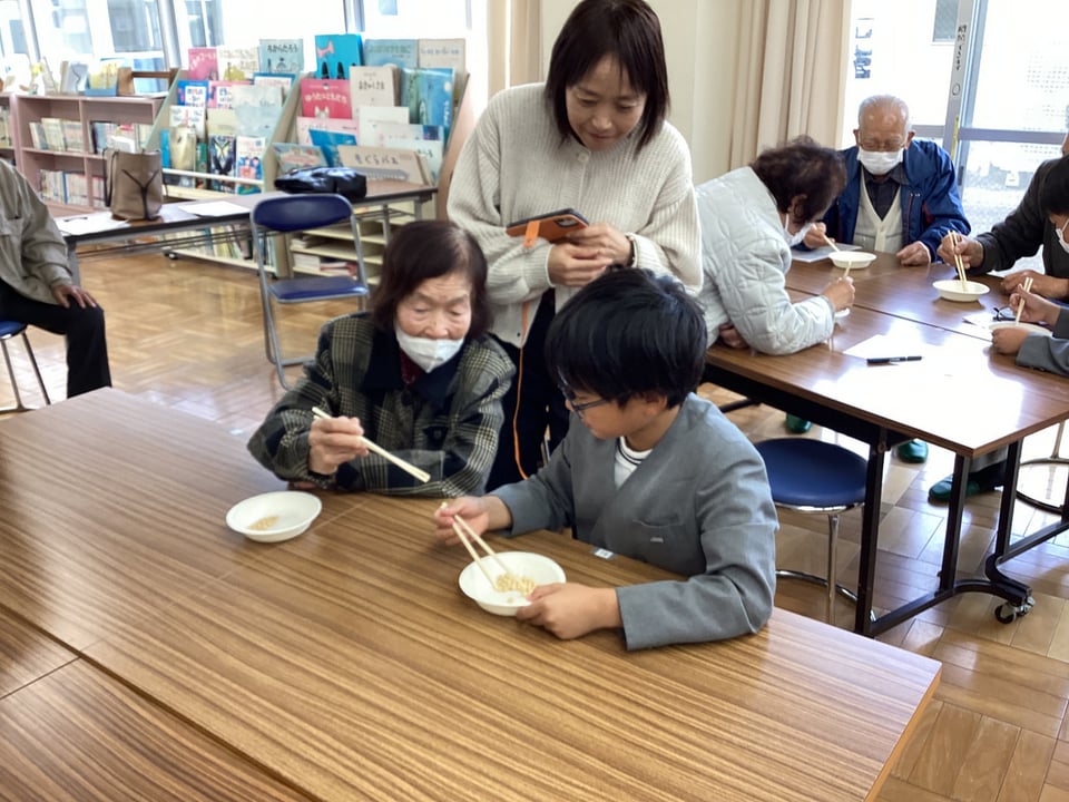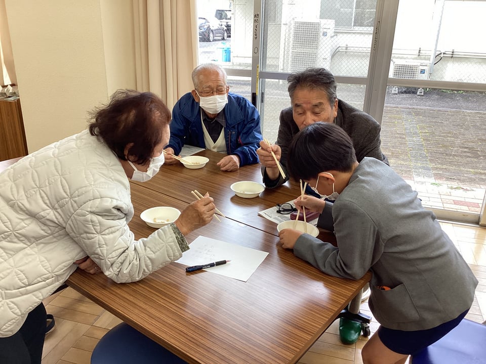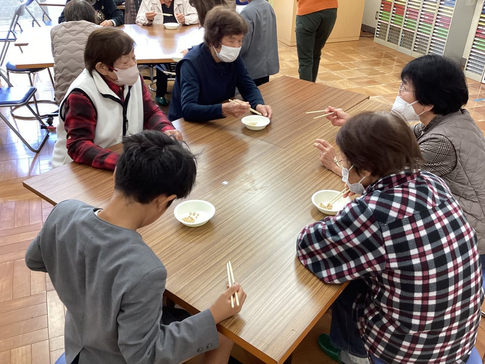 次は、各グループ対抗での「豆つかみ競争」を行いました。高齢者のみなさんがたくさんいらっしゃるので、子どもたちにとっては「正しい箸の持ち方」を学ぶ絶好の機会となりました。その後、グループの子どもと高齢者のみなさんで協力して配分された豆を中央の容器に移動する競争をしました。みんなで声を掛け合い、励まし合いながら豆つかみをする、笑顔いっぱい・ぬくもりいっぱいの活動となりました。
