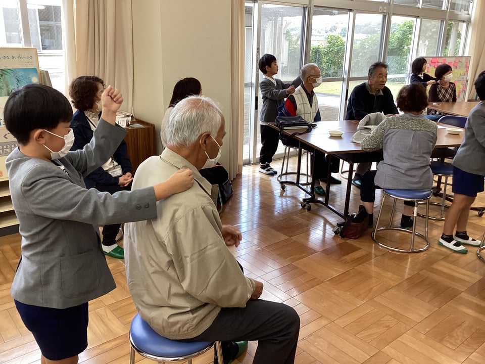 最後は、松寿会のみなさんへの「肩たたきタイム」です。正しい箸の持ち方を教えていただいたお礼に肩たたきを行いました。ここからは、1・2年生にも参加してもらい1~4年生全員で音楽に合わせて順番に肩たたきをしていきます。松寿会のみなさんには「これはうれしい!」と大変喜んでもらえました。