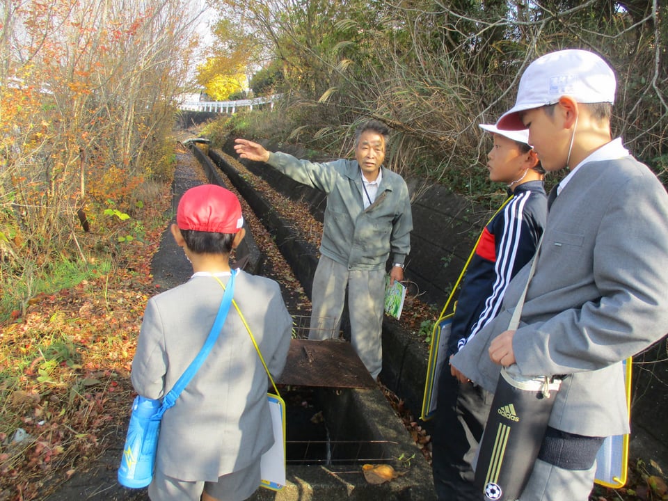 4年生は社会科学習で、二俣瀬地域の史跡「駒の頭」について学びました。二俣瀬地域の歴史に詳しい原田 滿洲夫 様に講師として来ていただきました。二俣瀬の木田地域は、稲作の水を厚東川からくみ上げることが難しかったそうです。そこで、水位の低い厚東川でなく、甲山川をせき止めて水位を高くして取水し、途中、厚東川の川底に木のパイプを通して田んぼに水を送りました。この水の送り方を「サイフォン式」と言い、当時としてはとても珍しかったそうです。子どもたちは、昔の人たちの知恵に驚いていました。このような史跡が二俣瀬に残っていることに感心しました。原田 滿洲夫さん、子どもたちのために貴重なお話と解説をしていただき、心からお礼申し上げます。ありがとうございました。