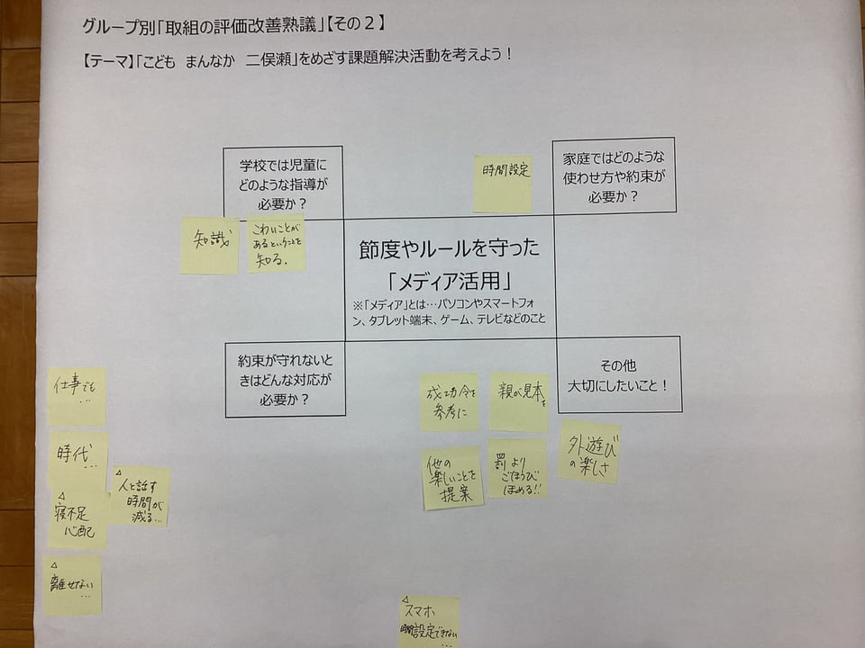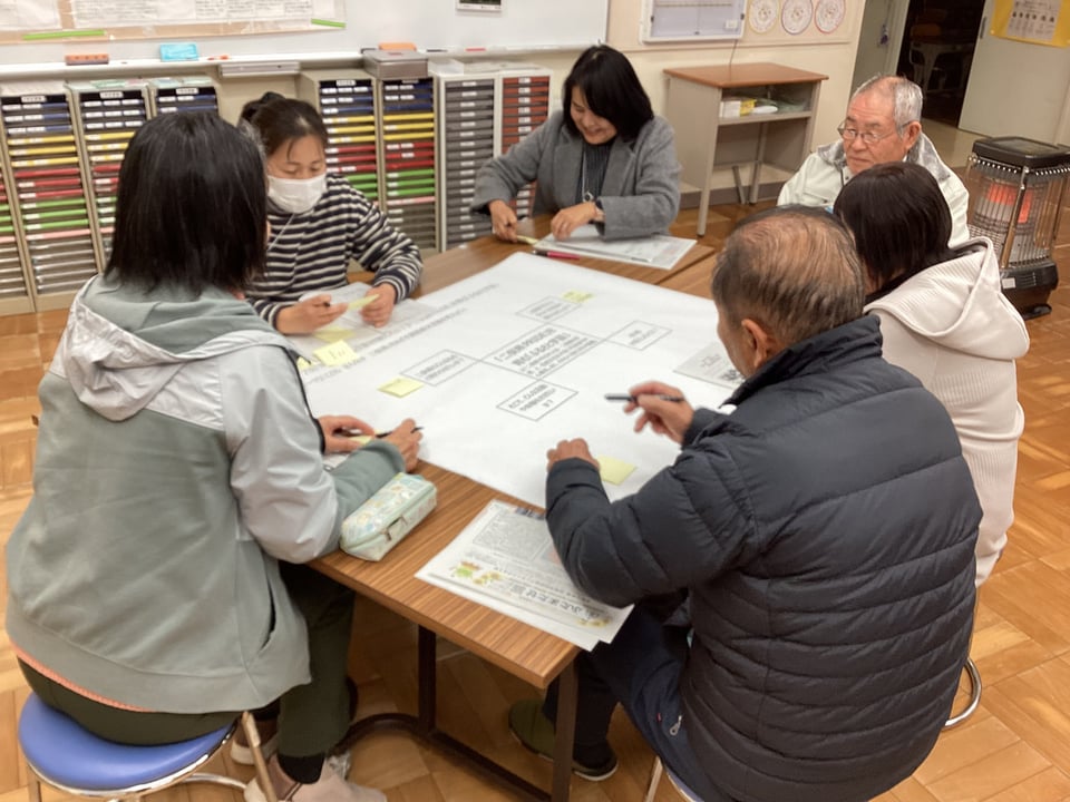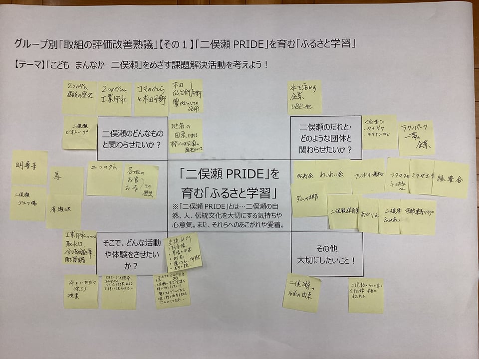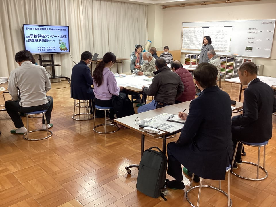 1月23日、第4回学校運営協議会を開催しました。今回は、学校運営協議会委員及び学校応援団、教職員による大人熟議です。テーマは、「『こども まんなか 二俣瀬』をめざす課題解決活動を考えよう!」です。後期学校評価アンケート結果の課題を共有し、焦点化した「まなび・せいかつ」課題についての協議を通して、取組を見直し、課題解決に向けた活動アイディアをたくさん出し合うことを目的としました。3つのグループに分かれて、「①『ふたまたせPRIDE』を育む『ふるさと学習』について」「②節度やルールを守った『メディア活用』について」、それぞれ熟議し、たくさんのアイディアや提言をいただきました。互いのグループで出た意見を共有し合い、講師の宇部市教委の先生方から指導助言もいただきました。
