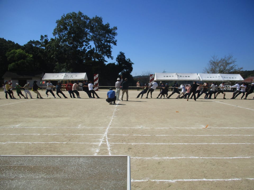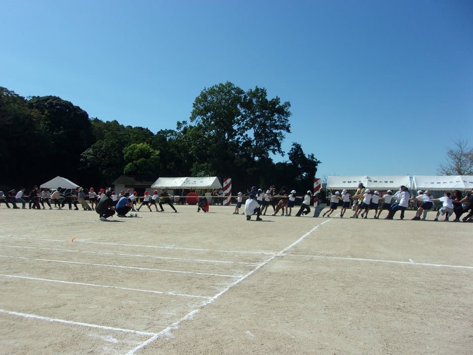 10月11日の学校・地域合同秋季大運動会の第5弾は、「綱引き」と「大玉リレー」です。綱引きの第1回戦は、赤白に分かれた子どもたちだけで勝負します。なかなかの接戦でした。その次は、子どもたちの対戦に保護者も加わっての勝負となります。そして、最後は、地区ごとの合同チームに分かれての対戦となります。この綱引きは、運動会の恒例種目で単純な力比べですが、思わず本気になってしまう魅力があります。
