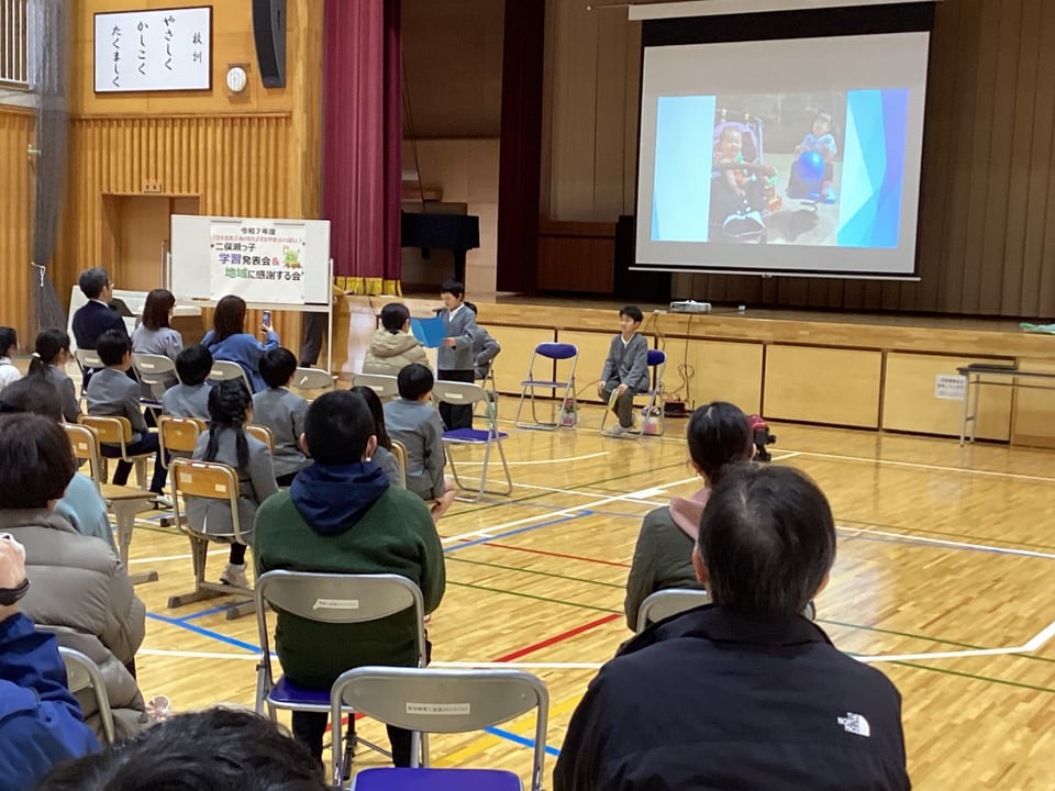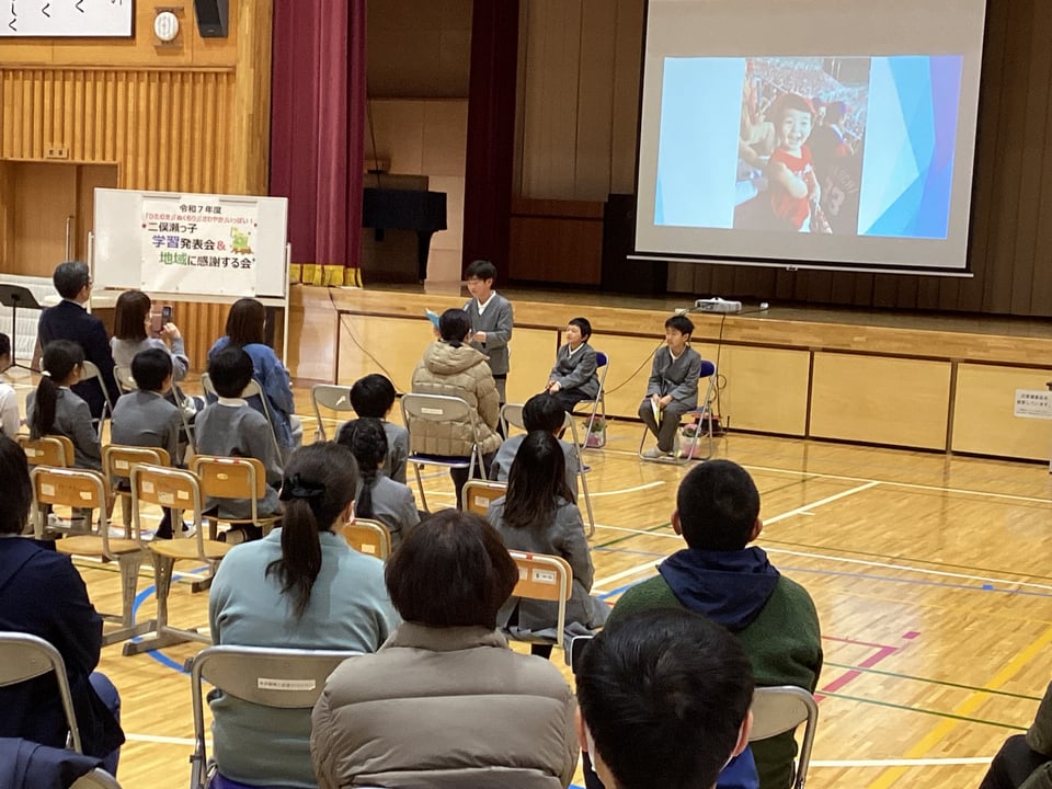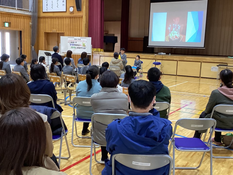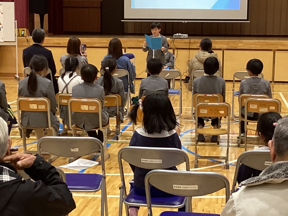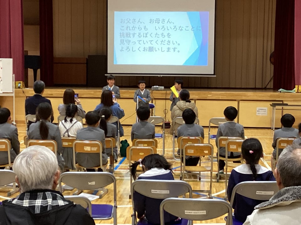 2月19日の学習発表会では、4年生の総合「十歳を祝う会」も行いました。全校の子どもたち、保護者・地域のみなさんの前で、この「十歳を祝う会」を行うのが、本校の特色です。この会では、まず4年生の子どもたち一人ひとりから「将来の夢」の発表がありました。子どもたちは、自分の夢を堂々と詳しく発表することができました。自分の夢に向かって、これからいろいろな人とつながりながら、日々チャレンジしてください。次に、4年生からお家の方々に向けた「感謝の手紙」発表がありました。家族一人ひとりに向けた自分の思いをはっきりと伝えることができました。お家の方々はもちろんですが、会場にいるみんながとても温かい気持ちになることができました。全校の前で「十歳を祝う会」を行う意義がここにあります。学校・地域のみんなで4年生をお祝いするぬくもりいっぱいの会となりました。