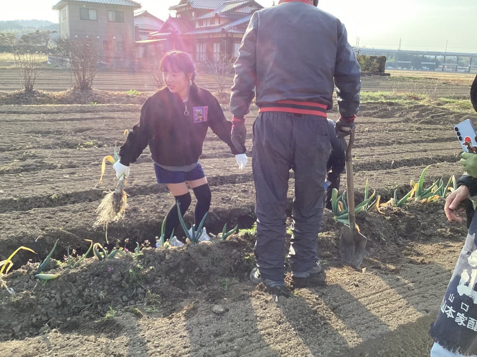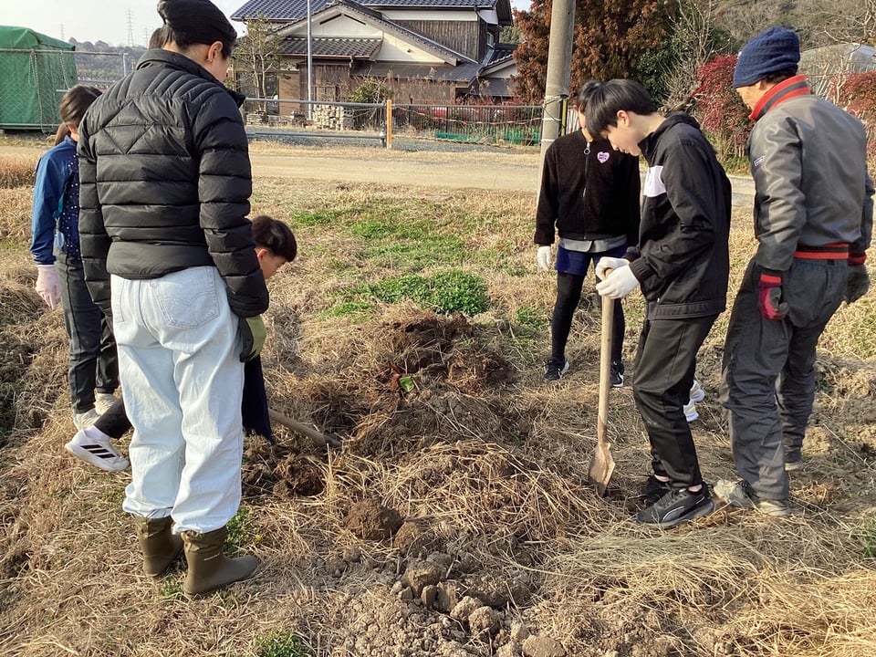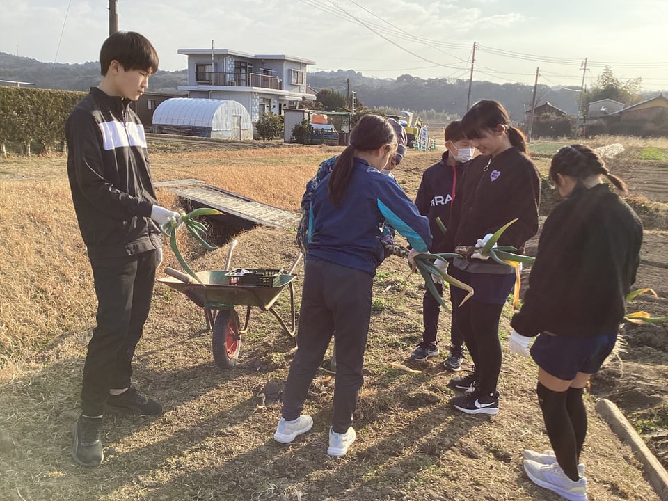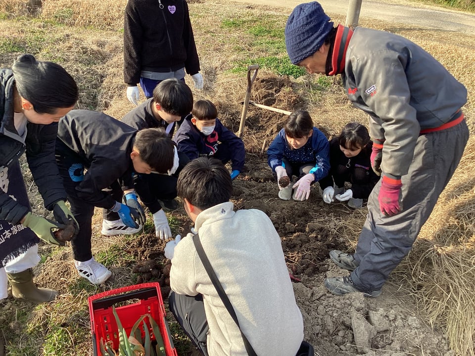 一つ目は、ねぎ・サトイモの農家さんです。子どもたちが試作するメニュー「かす汁」の材料となるねぎとサトイモを地域の農家さんで収穫させていただきました。どちらの収穫も子どもたちにとっては初体験でした。太くしっかりとした立派なねぎに、子どもたちは驚いていました。さらに驚いたのは、サトイモの収穫。寒さに弱いサトイモは草等を畑の上にかぶせ、保温します。それをのけて、親芋ごと収穫します。これも初体験で、親芋にくっついた子芋を採り、土や根をきれいにのけて収穫です。子どもたちにとって、初めての収穫体験はとても貴重なものとなりました。