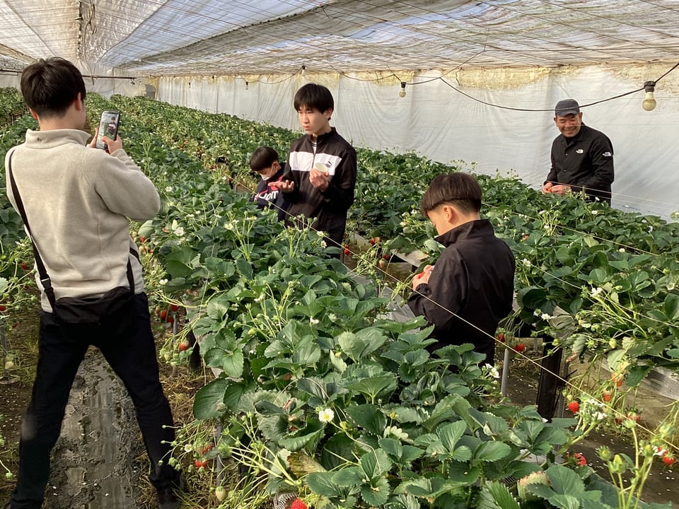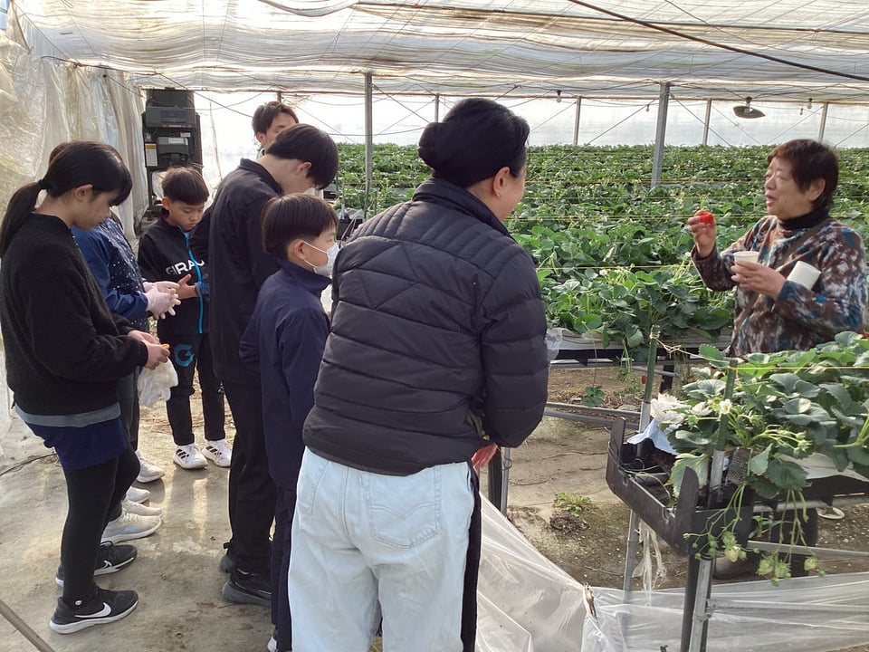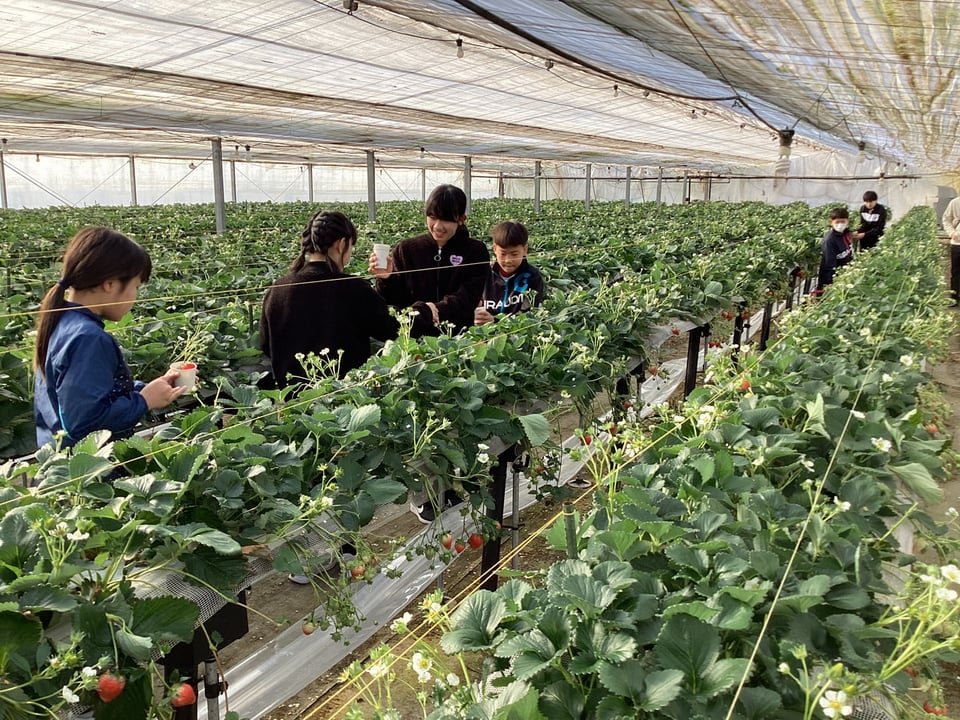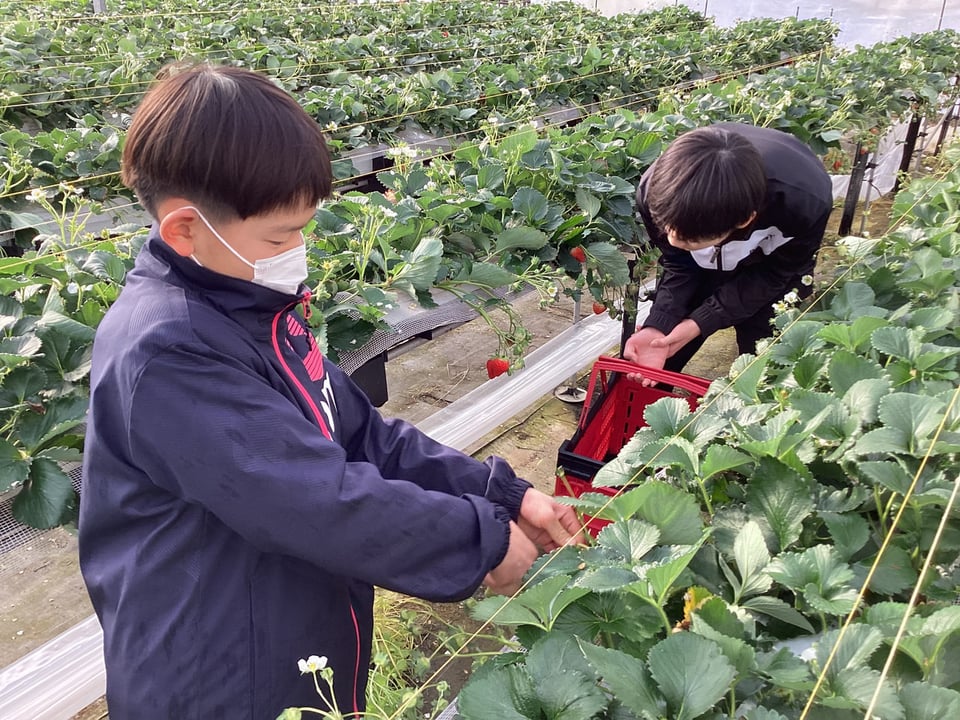 二つ目は、イチゴの農家さんです。子どもたちが試作するメニュー「パフェ」の材料となるイチゴを地域のイチゴ農家さんで収穫させていただきました。ここでは、まず試食させていただきました。イチゴの摘み方を教えてもらい、子どもたちはその場でパクっと試食です。「甘くておいしい!」とみんな笑顔になりました。その後、試作用のイチゴをいくつか収穫させていただきました。これは絶対においしいパフェを完成させなければなりません。自分たちが試作するメニューの食材を知ることも大切な職場体験になるのですね。