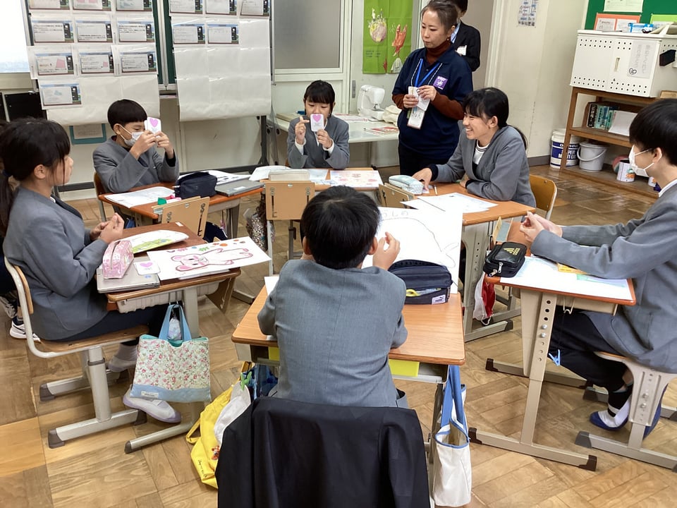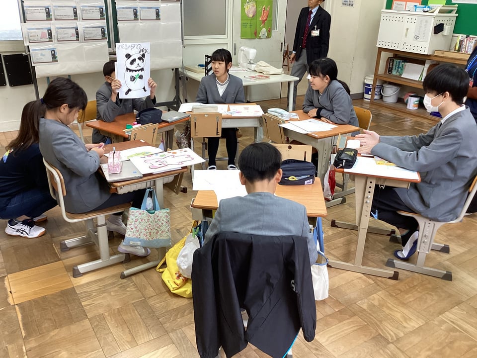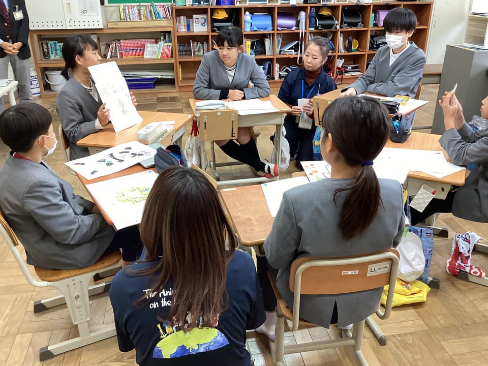 その次はいよいよ自分たちの番です。事前課題として作った「動物新聞」をもとに、自分が設定したキャラクターになりきり、その視点で、みんなと対話していきます。「自分たちが困っていること・人間に言いたいこと」を発表して、その発表に対してリアクションカードを提示しながら、双方向に話すようにしていきます。なかなかなりきり対話を続けていくことは難しかったですが、スタッフのみなさんに助けてもらいながら、だんだんと自分たちで対話したり、互いの考えにリアクションしたりすることができるようになりました。動物の視点に立ってみると、今まで見えなかった人間の問題点や環境問題に気付くことができるきっかけとなりました。