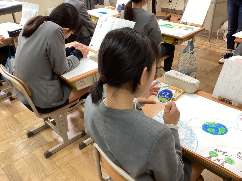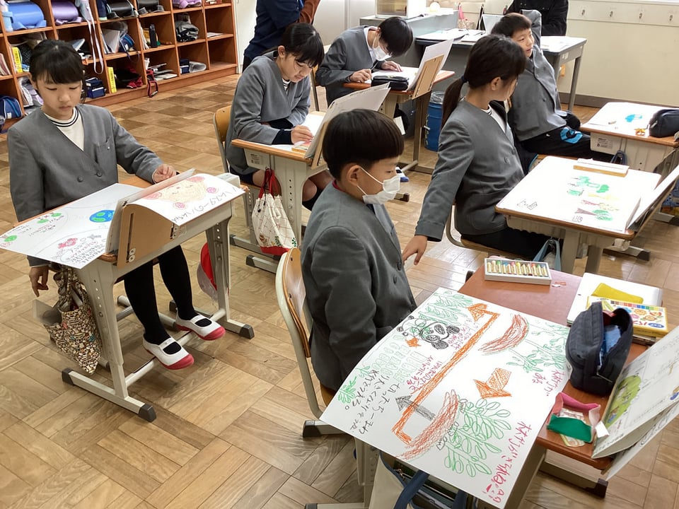 そして、会議後は振り返りとして、会議を通して学んだことや考えたことを、自分のキャラクターの立場になって、絵や文で自由にまとめる活動を行いました。最後には、自分たちの日々の生活の中でできる環境問題対策を行っていくエールを受け取り、がんばり賞としてのシールをいただきました。スタッフのみなさん、貴重な経験をさせていただき、ありがとうございました。