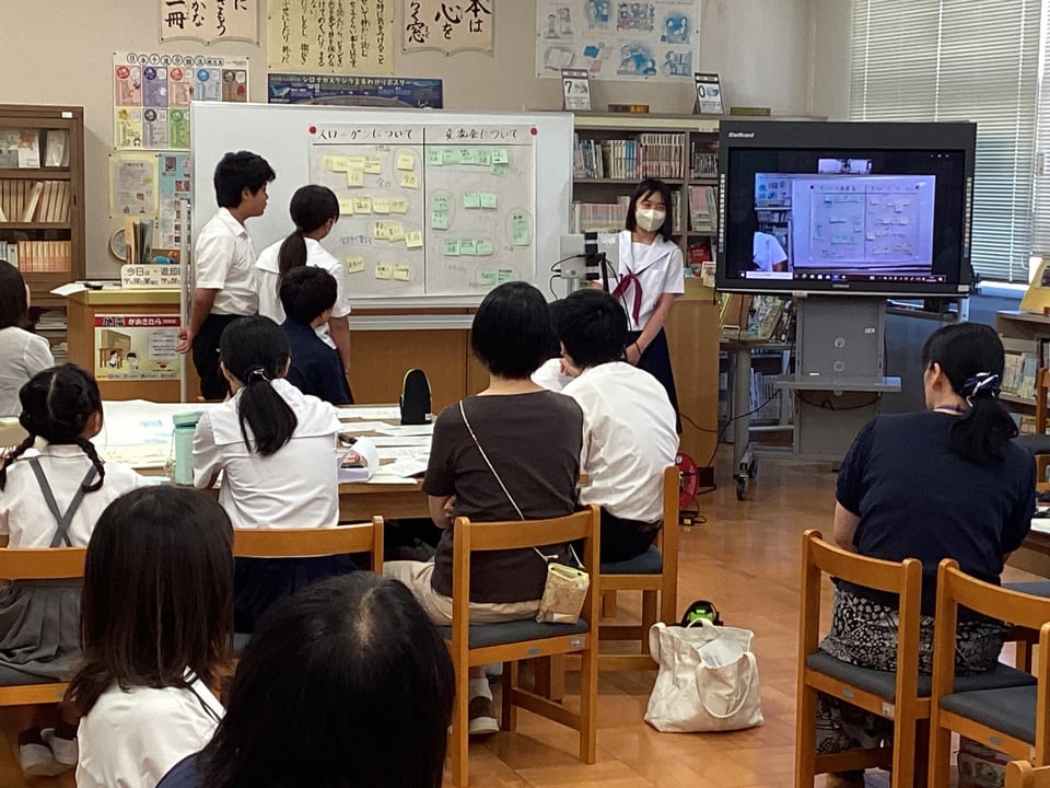 最後に、各校で出た考えをオンラインでつなぎ、情報共有しました。中学生がうまく意見を整理しながら発表することができました。小学生は、こんな中学生の姿にあこがれをもちながら、成長していくのだと思います。今後は、各校で出た案を中学生が再整理して、いくつかの案にまとめ、それらをもとに、小中学生や教職員・地域の方によるアンケート調査によって、スローガンや交流会の内容を決めていく予定です。