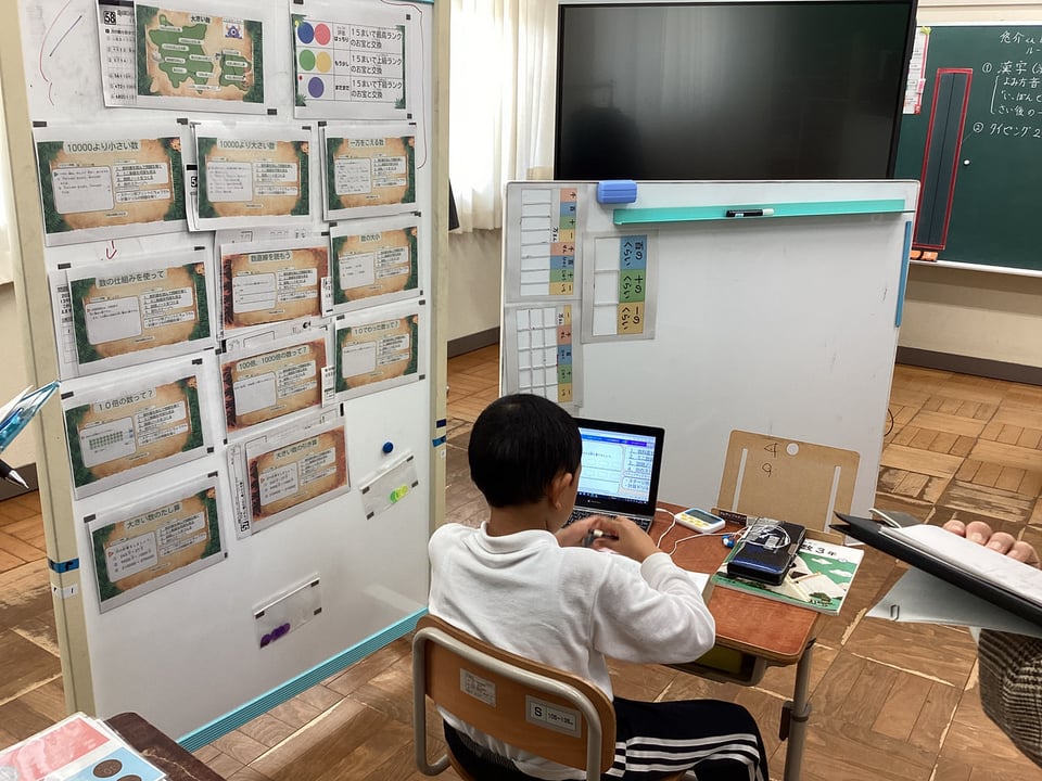 11月13日、なかよし学級の算数「自由進度学習」の公開授業研究会を実施しました。3年算数「大きい数」、6年算数「拡大図と縮図」です。なかよし学級では、「クエスト型自由進度学習」という学習方法を行っています。これは、単元内を小単元のステージに分け、進み方を指定しながらも、ペースややり方を子どもに選択させる学習方法です。1時間の授業でどれだけ進んでも、戻ってもよいのですが、各ステージに設定されている「クエスト問題(必ず解く問題)」を解き、担任に丸付けをしてもらわなければ、先に進むことができません。そこで、子どもは「教科書から学ぶ」「担任が作成したミニ動画から学ぶ」などのやり方を選択しながら、その「クエスト問題」を解くための方法を考えるようにしていきます。
