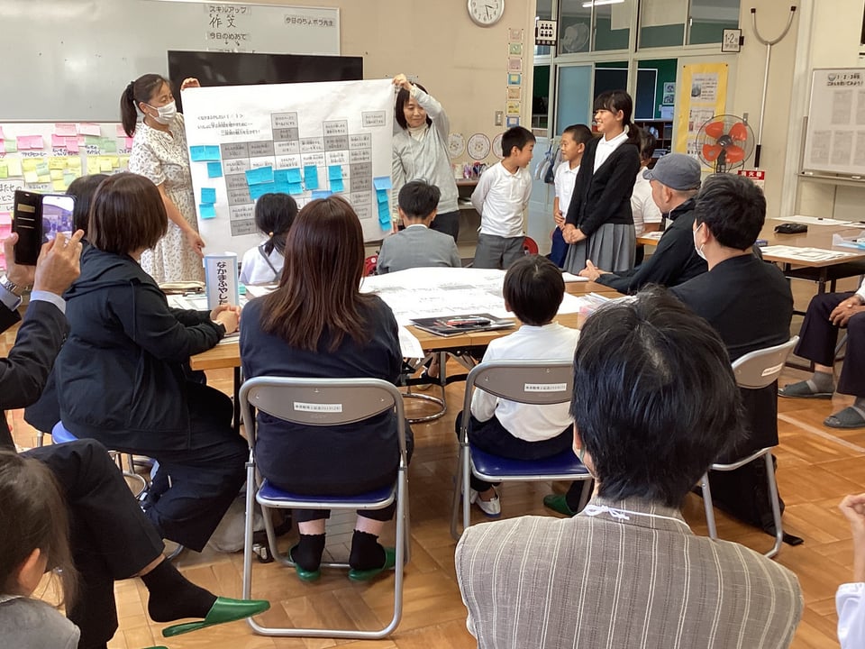 それから、6つのグループそれぞれで話し合ったことを共有するための「グループ別発表」の時間を取りました。みんなで話し合った「特認校として、一緒に学ぶ仲間を増やすために取り組みたいこと」を、各グループの子どもたちがみんなで発表している姿に驚きました。その姿の事実だけでも、子どもたちが本気になって考え、みんなと話し合った証だと思います。ここで出た「子どもたちの夢」を学校・家庭・地域が一体となって、これから叶えていくことが大切です。