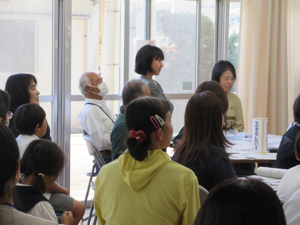 最後に、本日の熟議の振り返りを、子どもたちと保護者・地域のみなさんに発表してもらいました。自分ががんばったことや友達・地域の方々のよさ、子どもたちの素敵な姿、これから子どもたちや大人に期待することなどが出されました。会の終わりには宇部市教育委員会社会教育課の方から指導助言をいただきました。今回の「こども まんなか 二俣瀬」の考え方を大切にして、熟議したことを実行することの重要性を助言いただきました。