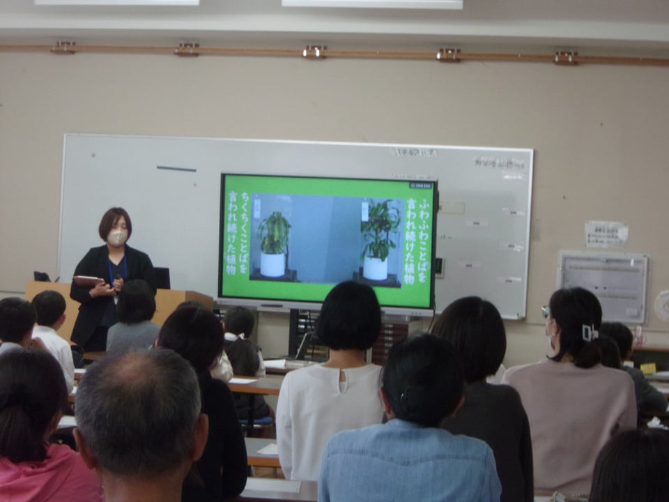 次に、「ふわふわ言葉をかけ続けた木」と「ちくちく言葉をかけ続けた木」の実験映像を視聴し、「ちくちく言葉をかけ続けた木」は枯れてしまうことを知りました。その後、絵本「ことばの かたち」の読み聞かせを聞きました。