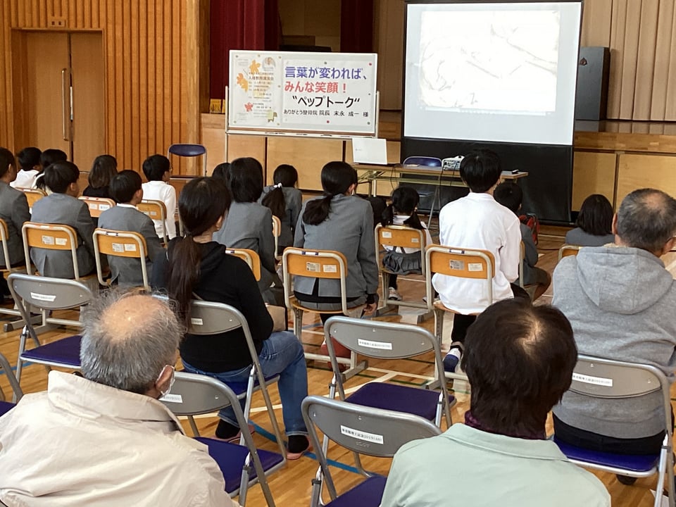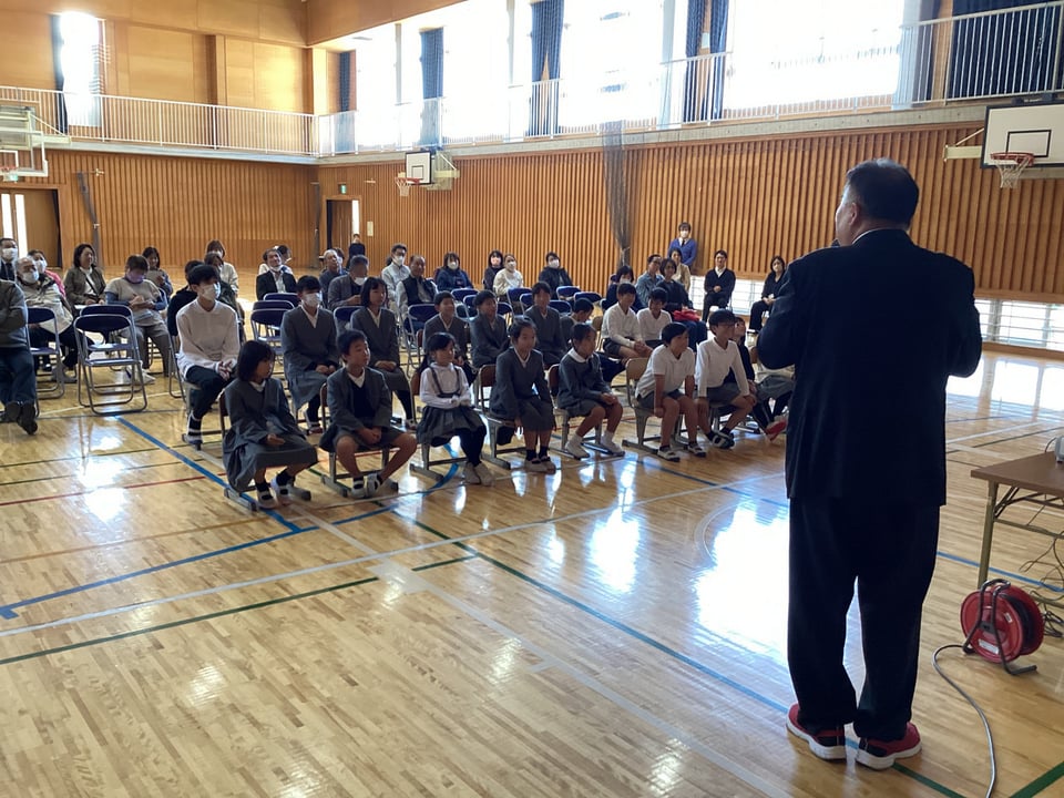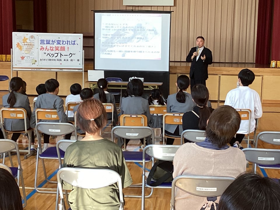 11月7日、人権教育講演会として、ありがとう整骨院 院長 末永 成一 様にご講演いただきました。演題は「言葉が変われば、みんな笑顔!‟ペップトーク”」です。全校児童20名と保護者・地域のみなさん30名が参加してくださいました。たくさんのご参加に感謝いたします。