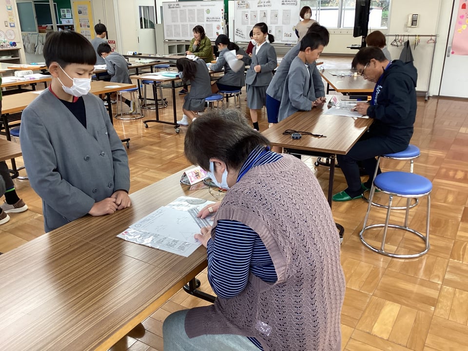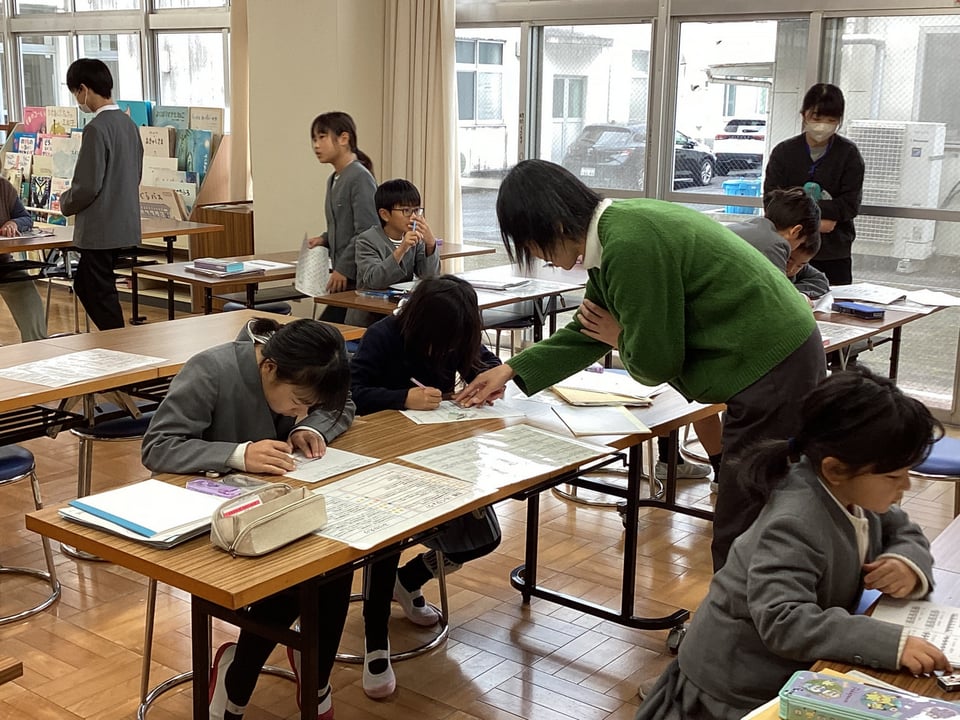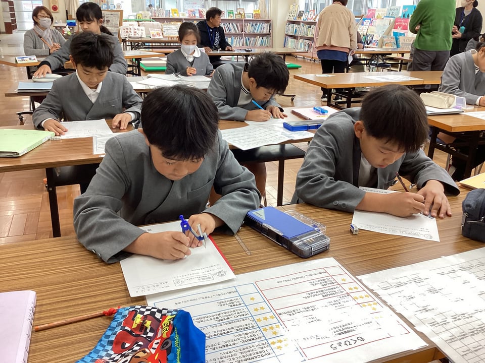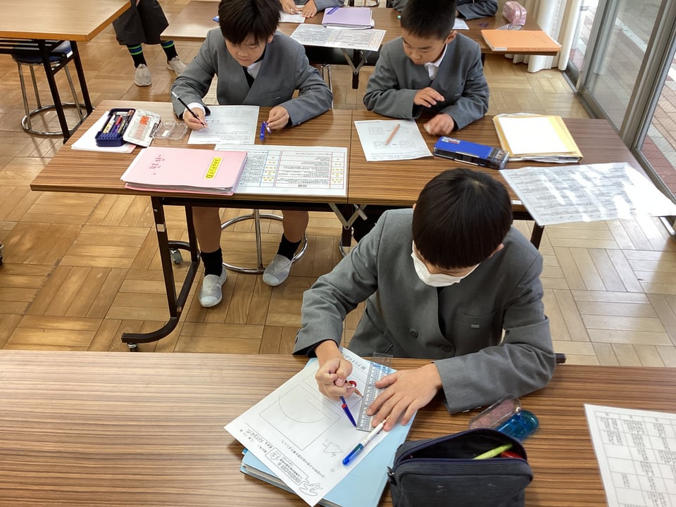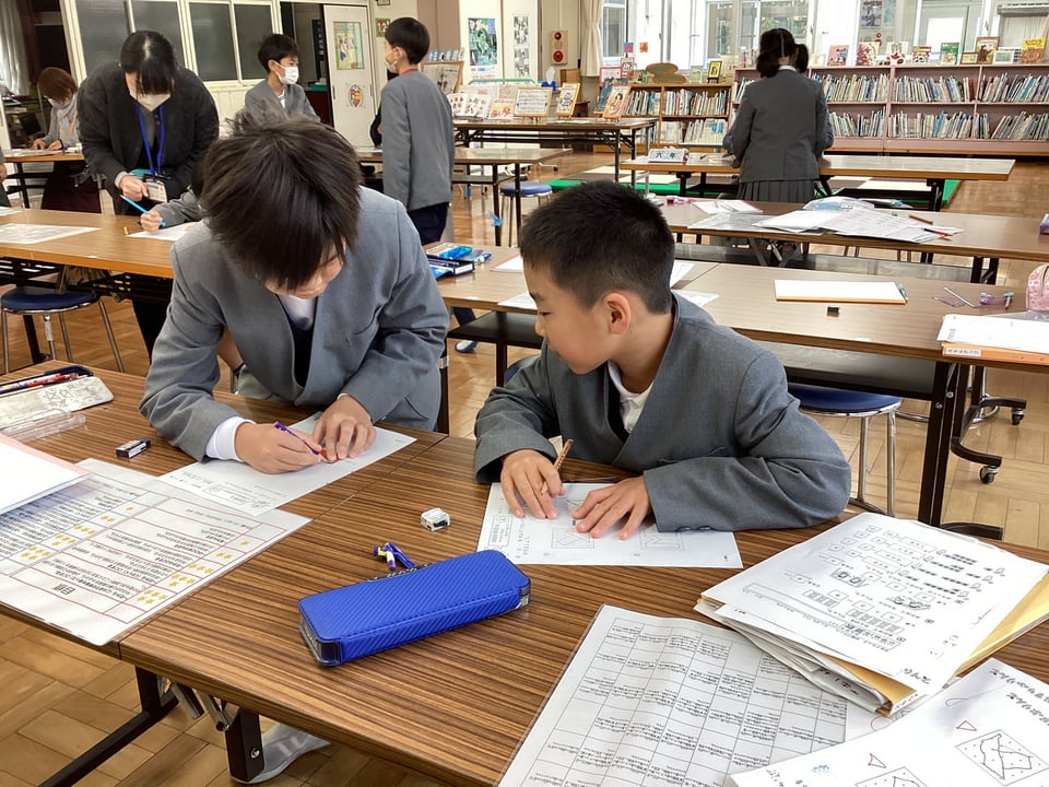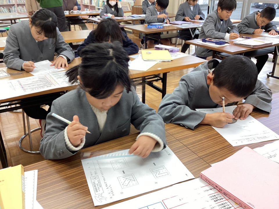 11月12日の算数の学び直しタイム「スキルアップ」の学習の様子です。この日は、全員「図形」の小テストからスタートしました。この「図形」単元を苦手にしている児童も多くいます。定規やコンパス、分度器、三角定規を用いながら、図形を作図したり角度を測ったりしています。これら経験が、学びの定着につながっていくはずです。ちょボラのみなさんに丸付けや評価してもらいながら、道具を活用した作図の力を高めました。異学年同士で教え合ったり、教員に支援してもらったりして自ら求め、学ぶ力も身に付いてきました。