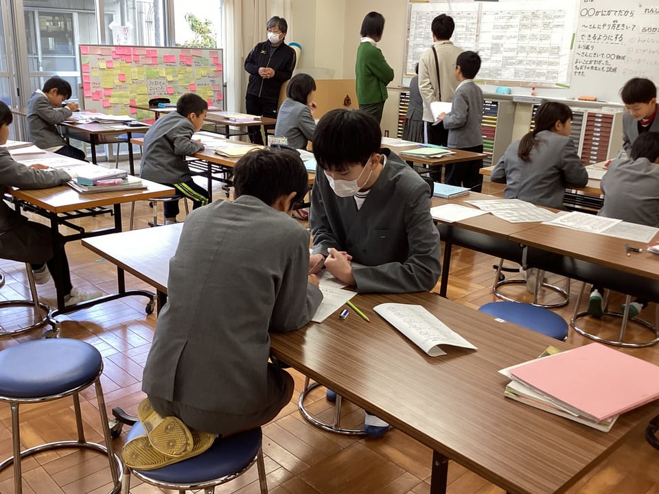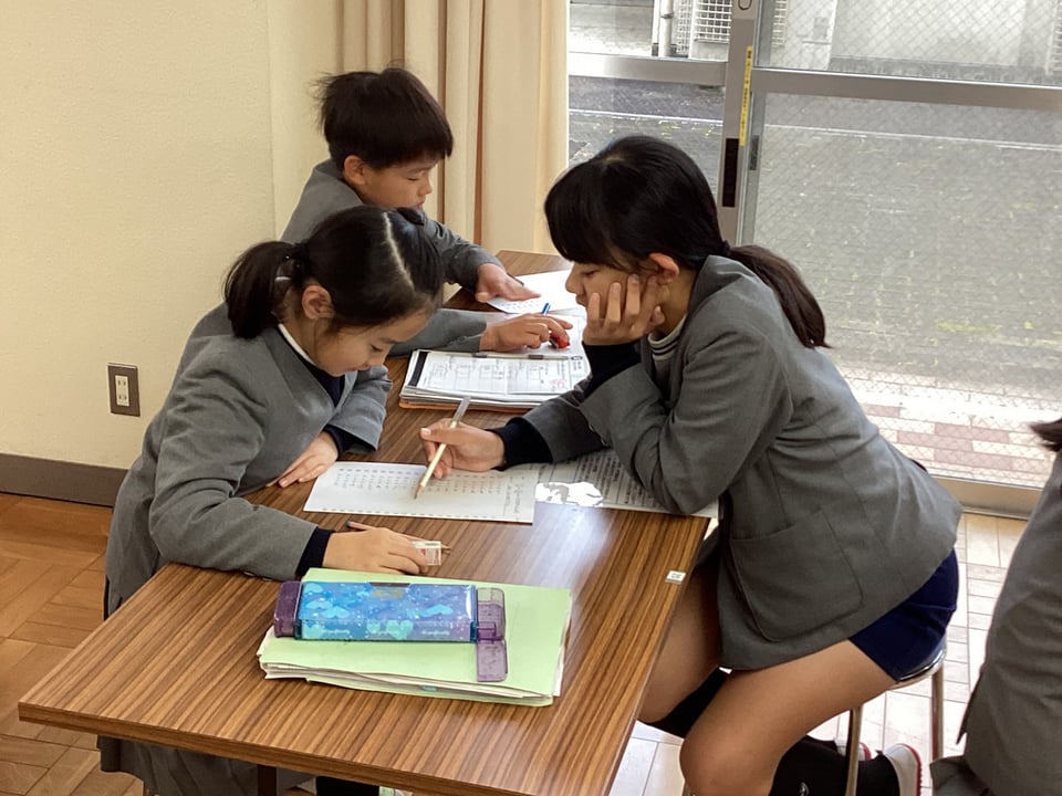 11月26日、全校での算数学び直しタイム「スキルアップ」を行いました。この日は、自分の苦手な領域に自ら取り組むことができるようにするために、これまで自分がやってきたプリントの中で「×」のあった領域を振り返ることからスタートしました。その自分が苦手な箇所について「わからない」ことを進んで友達や教員に教えてもらい、わかったことを自分なりに端的に説明できるようにすることで、一人でもできるようになることをめざします。