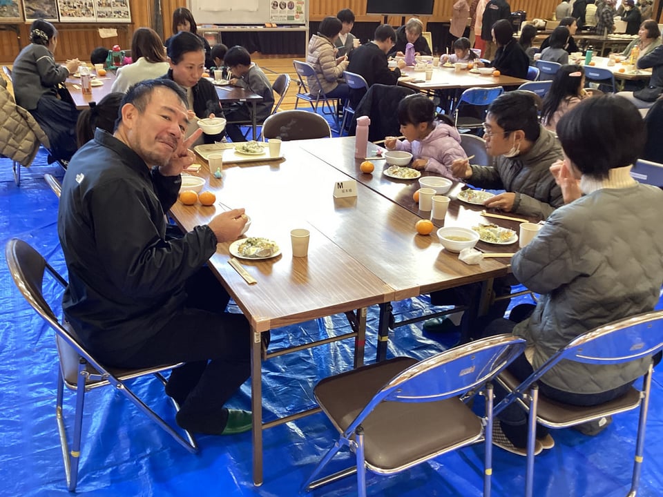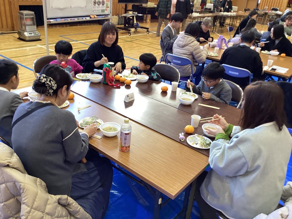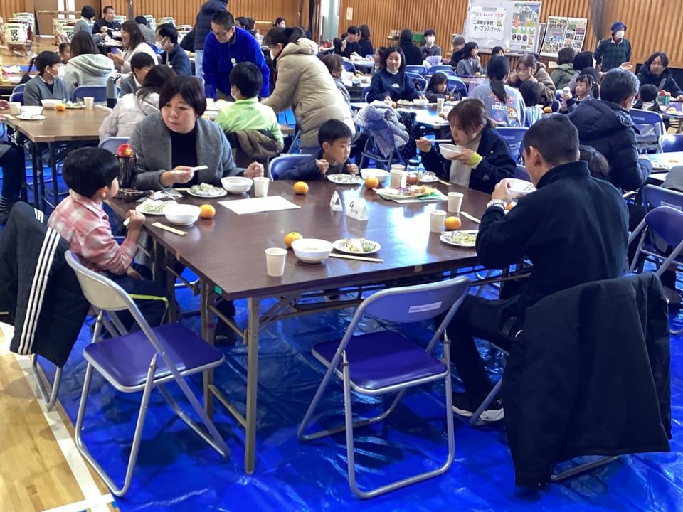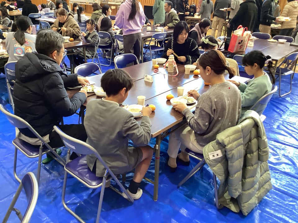 12月6日のオープンスクールの昼食・交流タイム「みんなでふるさとの味を味わおう」の様子です。この昼食・交流タイムでは、二俣瀬っ子と保護者、参加者全員で、二俣瀬の味を交流しながら味わいました。二俣瀬の「まちづくりサークル」女性部のみなさんが、前日から仕込みと調理をしてくださいました。本当にありがとうございます。この日のメニューは、「二俣瀬っ子バケツ稲の菜めし」と「地元産栗・芋ご飯」、「地元産野菜たっぷりの豚汁」、「地元産大根の美人漬けときんぴら」、「地元産スイートポテト」です。二俣瀬のぬくもりいっぱいのふるさとの味です。参加者の子どもたち・保護者のみなさんが、豚汁をたくさんおかわりしてくださり、まちづくりサークルのみなさんは、とても喜んでおられました。みなさん、ふるさとの味に満足してくださったようで安心しました。それぞれのテーブルでは、互いの会話もはずみ、みなさんが楽しく交流されながら会食することができてホッとしています。