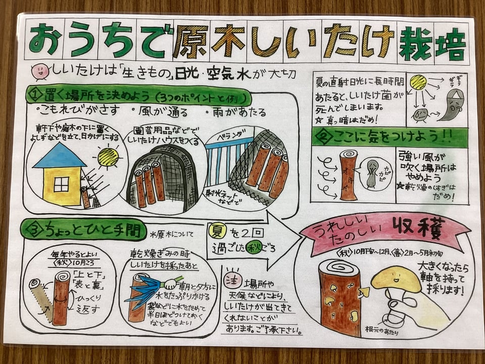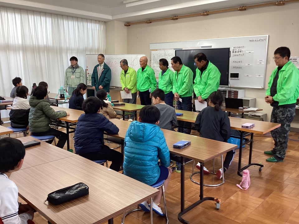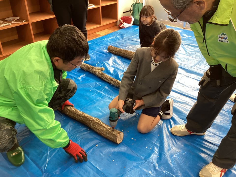 山口県美祢農林水産事務所森林づくり推進課のみなさん、宇部市林業研究会のみなさん、本日はわたしたちの生活を守ってくれている森の話を聞かせてくださったり、貴重な「シイタケのこま打ち」体験をさせてくださったりして、本当にありがとうございました。子どもたちは、森のことが大好きになったはずです。最後に、木の枝に息を吹き込む実験では、反対の枝の先から息の泡が出てきたときには、大変盛り上がりました。みんなびっくりでした!