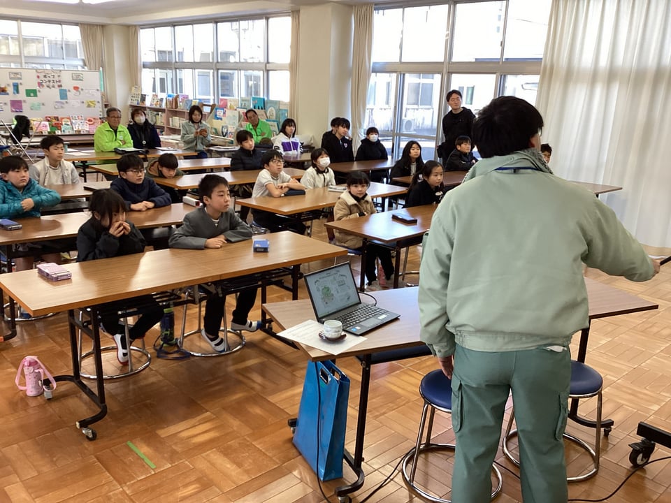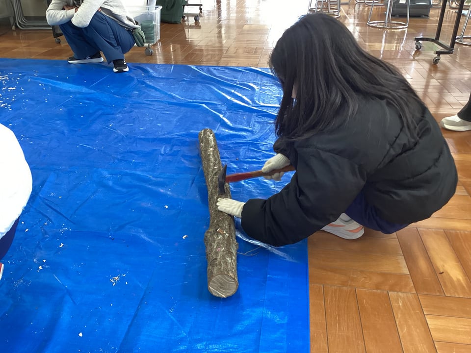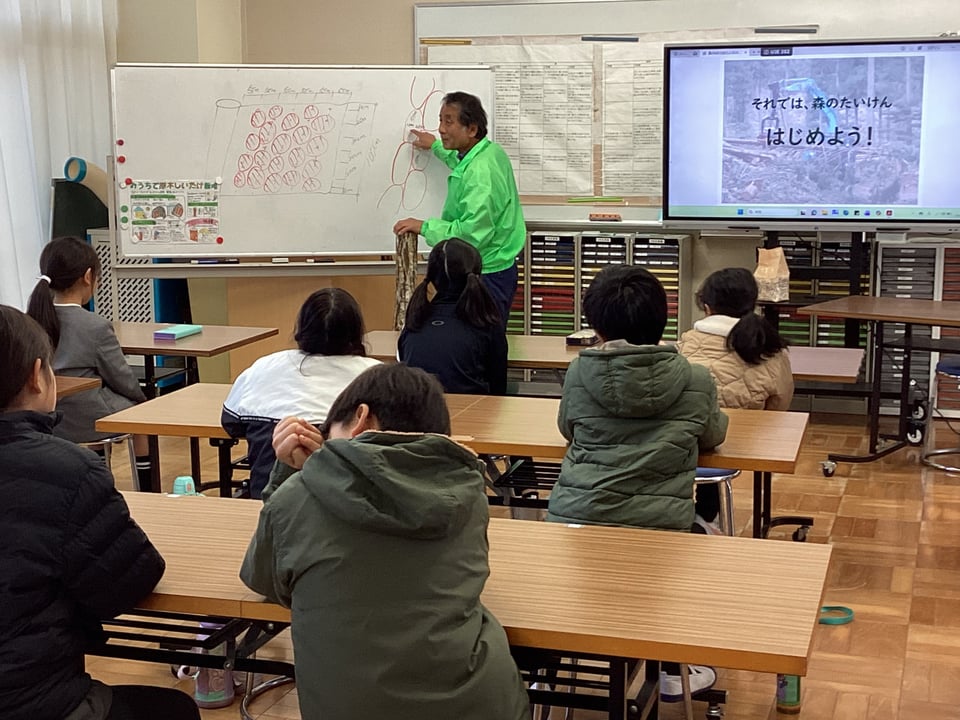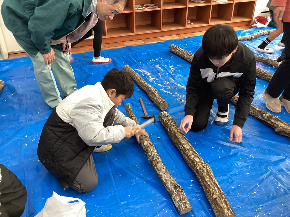 2月9日、山口県美祢農林水産事務所森林づくり推進課のみなさんと宇部市林業研究会のみなさんをお迎えして、全校児童が「森の学校」を体験しました。この事業は、子どもたちに森林の役割や林業に関する仕事についての理解を深めることをねらいとしています。講座では、はじめにスライド資料等を用いて「森林の役割や林業の仕事、シイタケの栽培方法」に関するお話を聞きました。わたしたちの暮らす二俣瀬も山や森林に囲まれていますが、この山や森林がわたしたちの生活を守ってくれていることを再認識しました。その後は、いよいよ「シイタケのこま打ち」です。子どもたちは、用意していただいた原木にドリルで次々と楽しんで穴をあけていきます。なかなかさまになっている姿に感心しました。そして、その穴にシイタケの菌のついたこまを打ち込んでいきます。子どもたちは、金づちトントンを楽しみながらあっという間に、こま打ちは終了しました。このシイタケの原木は2年間ゆっくりねかせてから収穫を迎えるということでした。5・6年生にとっては卒業後の収穫となりますが、これで小学校とのつながりもできましたので、いつでも様子を見に来てくださいね。子どもたちには、あまり人気のない「シイタケ」でしたが、きっと採れたての味は違うはずです。2年後を楽しみにじっくりと成長を待ちましょう!