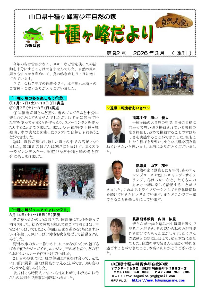> 十種ヶ峰青少年自然の家「十種ヶ峰だより」3月号
