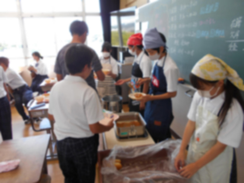 今日から2学期の給食が始まりました。今日のメニューの野菜スープ、パン、チリコンカン、チーズをみんなで美味しくいただきました。