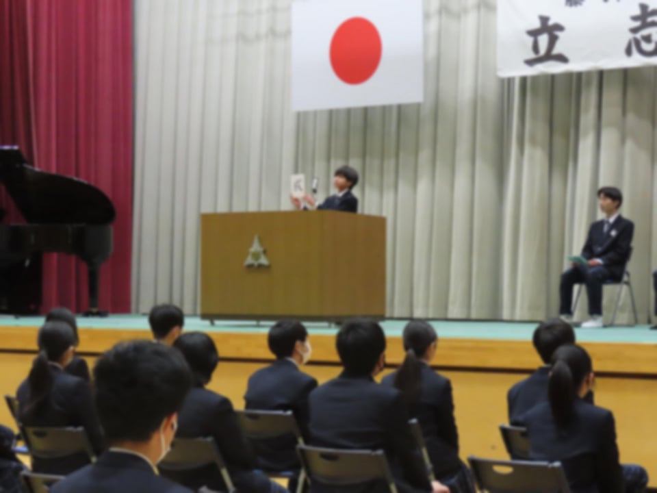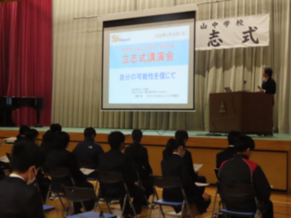 2月10日(火)に2年生は立志式を行いました。立志式では、自分の生き方や将来について考え、夢や目標等を漢字一文字で表現した発表を一人ずつ全員が行いました。また、学年合唱では、合唱曲「大切なもの」を素晴らしい歌声で披露しました。さらに、立志式記念講演として、山口県スポーツ協会より栗原啓様から「自分の可能性を信じて」のテーマで心に残るお話をいただきました。立志式では準備から学年全体で協力し、充実した内容と態度で終えることができました。