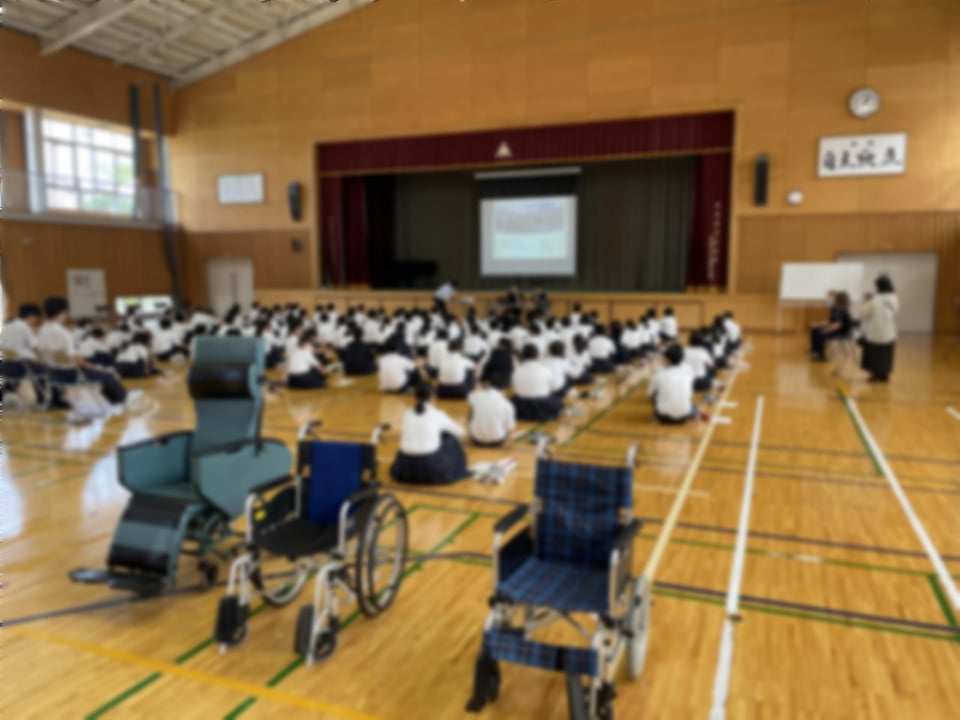 本日、2年生が「学ぶこと・働くことの意義を理解し、自分の果たすべき役割を考え、介護の仕事を学ぶ」ことを目的とした、介護理解促進授業を行いました。授業では、社会福祉法人 愛世会 特別養護老人ホームセンチュリー21の介護士さん方などに、介護職のやりがいについて講義を受けた後に、車いすを使った介護体験などを実施しました。