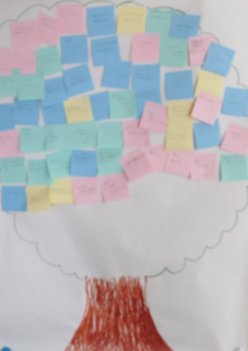 本校では昨年度から、藤山中校区の小学校と連携して「スクールワイドPBS(ポジティブな行動支援)」に取り組んでいます。これは、一人ひとりの望ましい行動に注目し、肯定的な言葉がけで学校全体を明るくする活動です。現在、学年フロアには大きな木の掲示物があり、生徒同士で見つけた「友だちの素敵な姿」を、木の葉に見立てた付箋に書いて貼っています。温かいメッセージでいっぱいの、大きな「善行の木」が完成するのが楽しみです!ます。