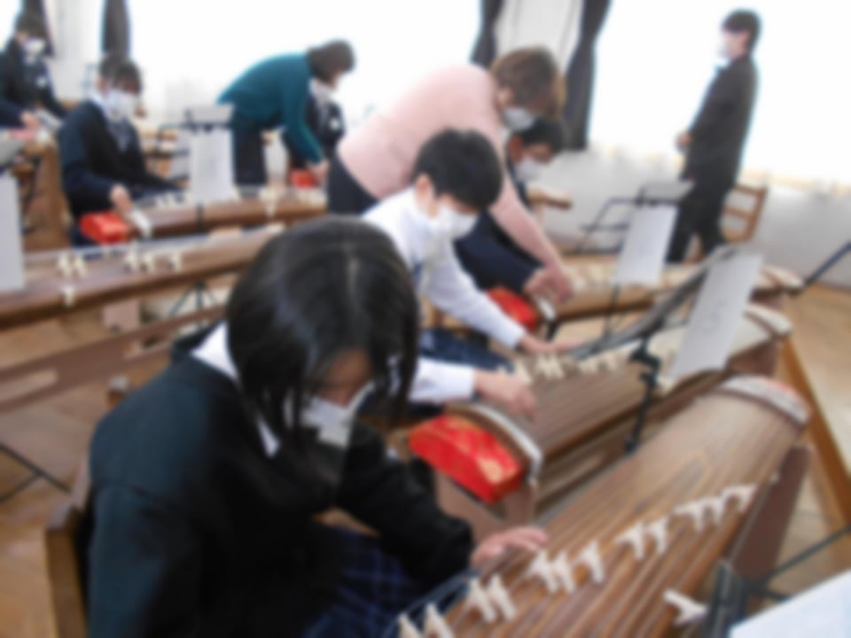 1月20日(火)の音楽の授業で、和楽器の箏に触れ、演奏に挑戦しました。「さくらさくら」を専門の先生から指導を受けながら、箏で上手に演奏することができていました。