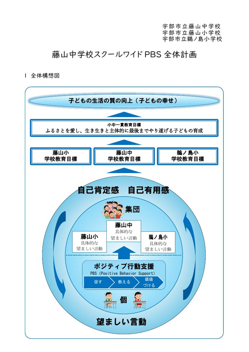 ポジティブ行動支援(PBS)とは、「ポジティブな行動(子どもの望ましい行動)をポジティブな方法(教える・促す・価値づける)で増やそう」という支援の考え方です。今年度も昨年度に引き続き、藤山中学校区でPBSの全体構想に基づいた取組を行います。