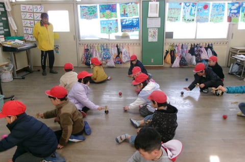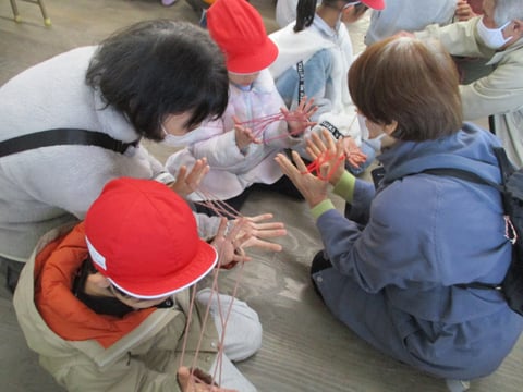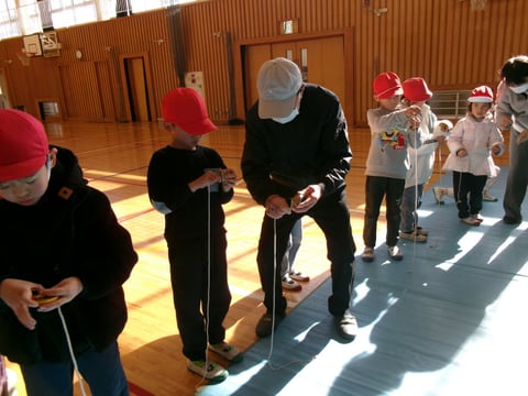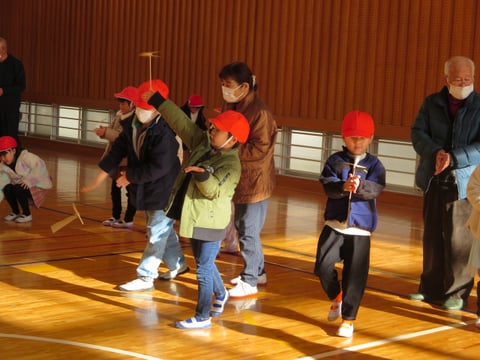 竹トンボ、コマ回し、けん玉、お手玉、あやとりの5つの遊びを、それぞれの”名人”から教えてもらい、新しいちびっこ名人も誕生したようです。最後には、竹トンボのプレゼントもありました。