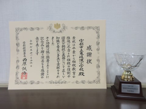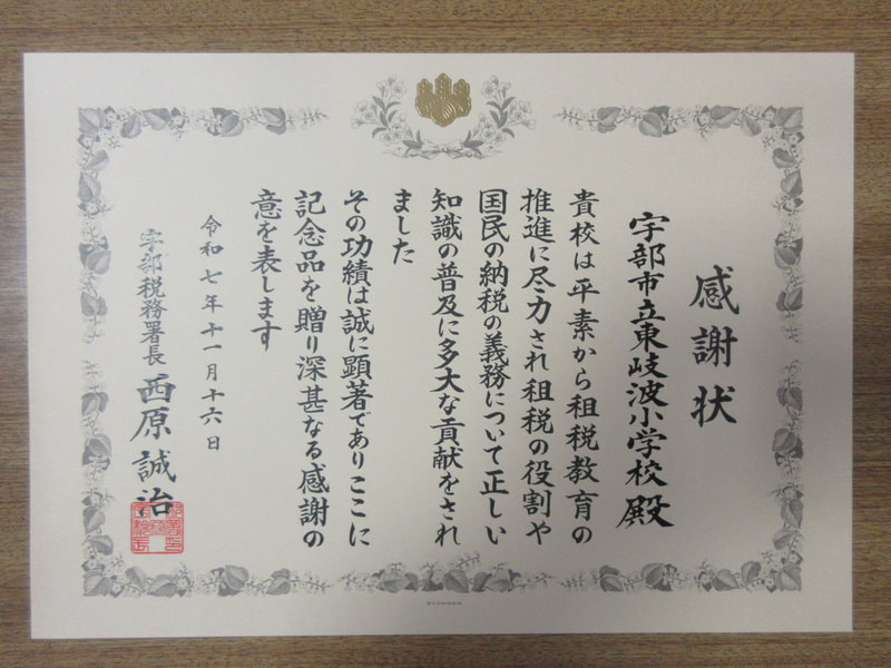 これは、本校のこれまでの租税教室の実施や税金に関する作品募集の応募などにかかわり、その実績に対する感謝状です。