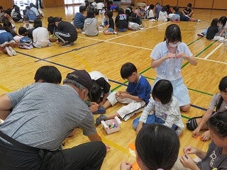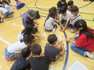 そのあとは、折り鶴づくりです。地域の方や高学年に教わりながら低学年児童もがんばりました。