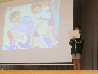 最初に、折り鶴を折るきっかけとなった佐々木貞子さんのお話を紙芝居にして皆さんに披露しました。