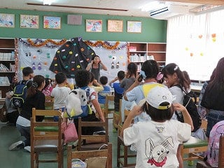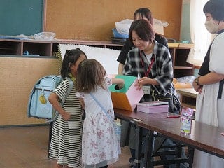 読み聞かせ「さくらんぼ」の皆さんの楽しいステージや、くじ引きやおかしつり、プラ板づくりなど、お土産がもらえるもの。