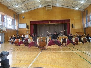 昨年末についた餅を焼いて入れた、熱々のぜんざいの接待もありました。体育館では、勇壮な太鼓の披露もありました。