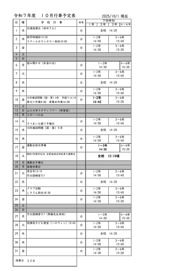 令和7年度10月の行事予定表です。今後変更になることもあります。