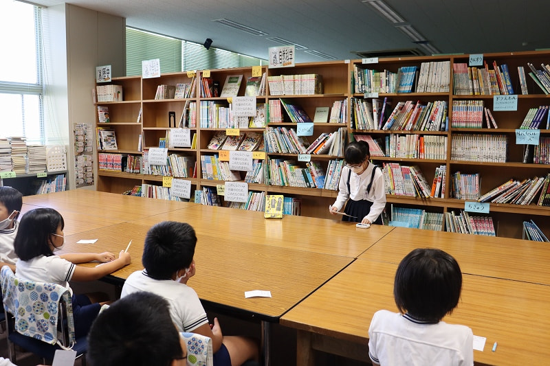 10/20図書委員によるビブリオバトルが行われました。5人の委員による、おすすめの本の紹介です!全校の子ども達が集まって、紹介のプレゼンテーションを聞きました。この日のために、図書委員の5人は、一生懸命準備を行い、おすすめの場面を選んで、みんなに紹介しました。聞いた人から、「どの本も読んでみたくなる」と感想をもらいました。紹介された本は、以下の本です。〇「しろがくろのパンダ」 〇「せかいいいち おおきなうち」 〇「このあと どうしちゃお」〇「わるがき7」 〇「てんから どどん」