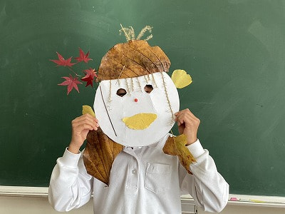 また、落ち葉の形や色を生かして、ユニークなお面が次々と出来上がりました。友達同士で見せ合いながら、笑顔が広がりました。