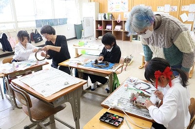 1・2年生が地域の方にご指導いただきながら、木の実や落ち葉を使った工作活動を行いました。
