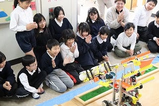 学習の最後には、小野田工業高校の生徒さんが自作したロボットのデモンストレーションを見せてくれました。ロボットがペットボトルやボールをつかんで運ぶたびに、大きな拍手と歓声が広がりました。実際に動くロボットを目の前で見ることで、子どもたちの将来への夢もさらに膨らんだようです。