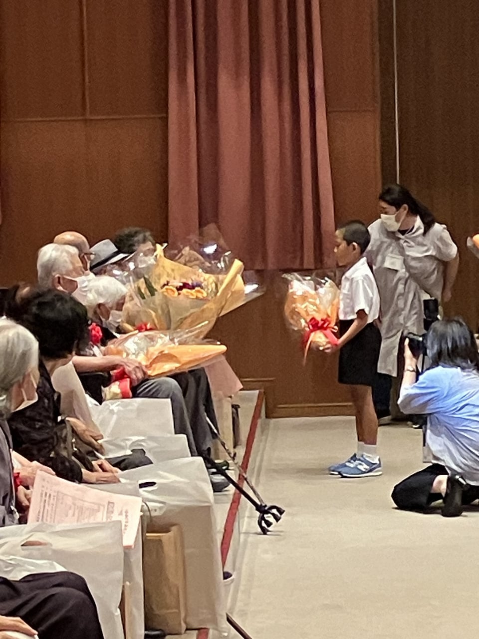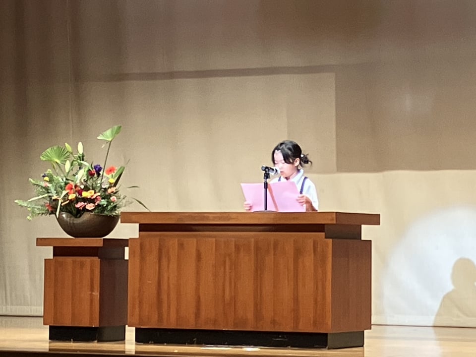 今年度は、吉部小学校から1年生と3年生の2名の児童が参加し、花束を渡したり、作文を読んだりして、心を込めてお祝いしました。子どもたちの姿に、会場の皆さんも笑顔になり、温かい雰囲気に包まれたひとときとなりました。
