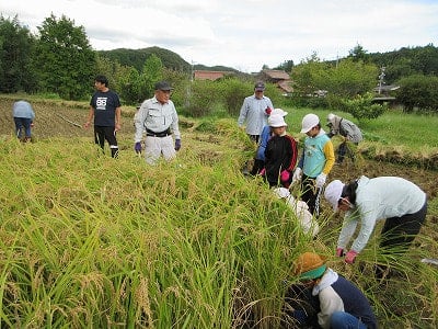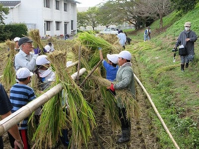 子どもたちが稲刈り体験をしました。秋晴れの空の下、鎌を使って稲を刈り、束にまとめて麻ひもで結び、はぜ掛けまで行いました。